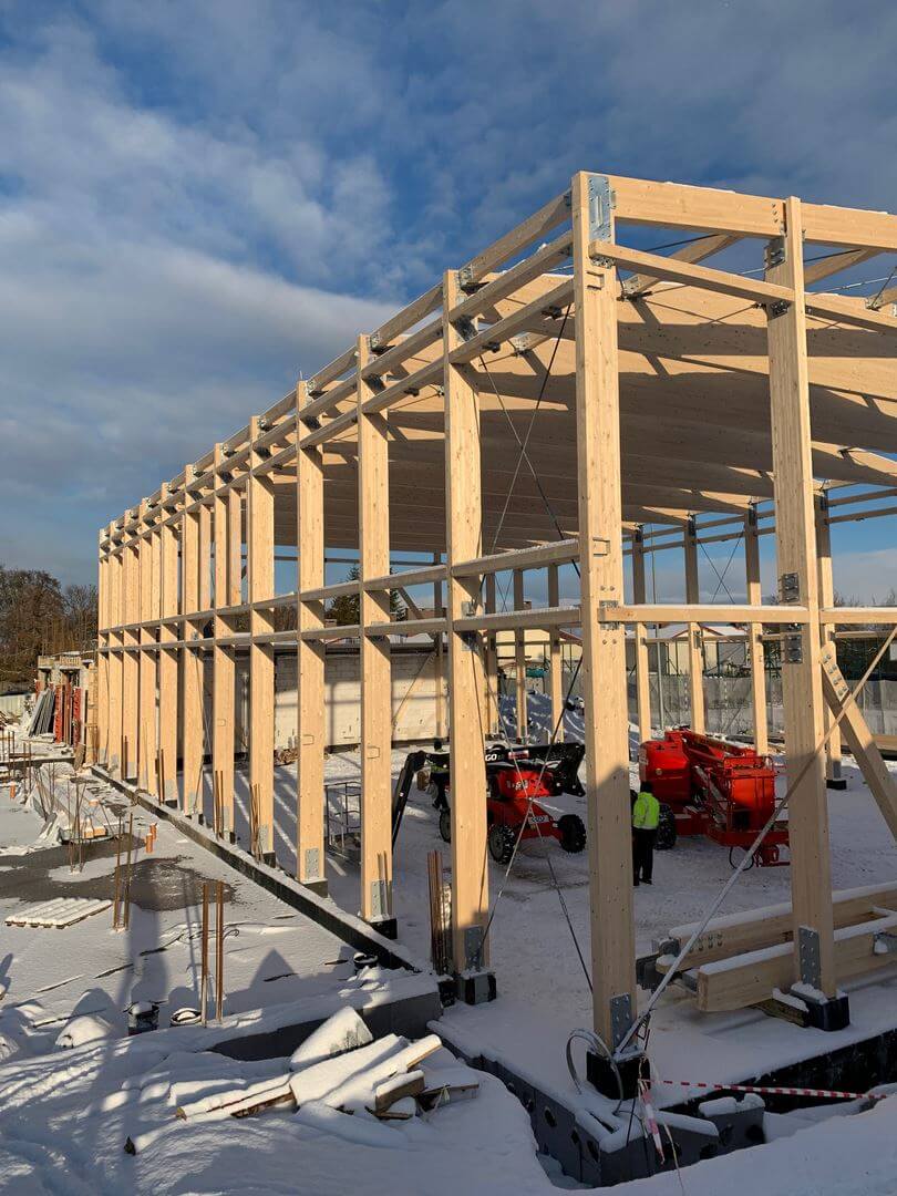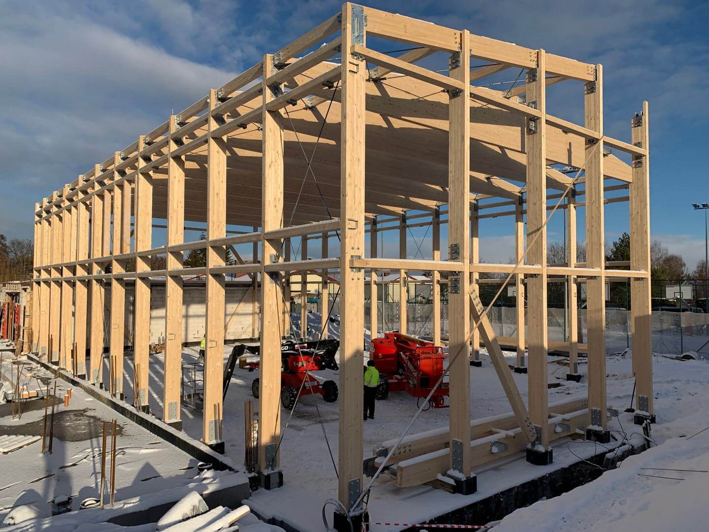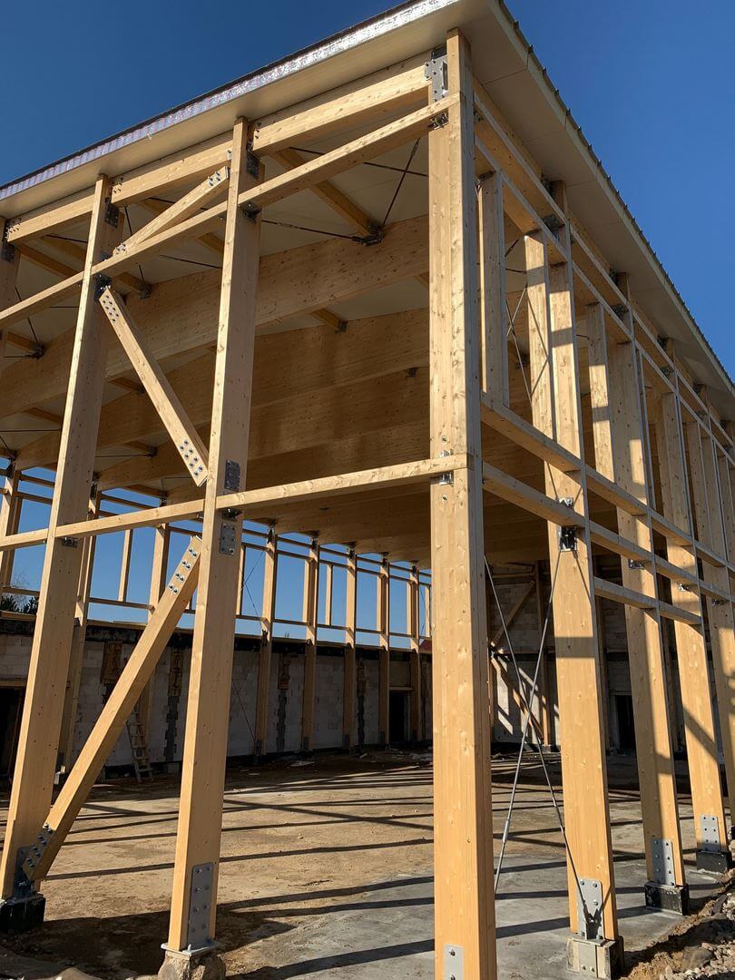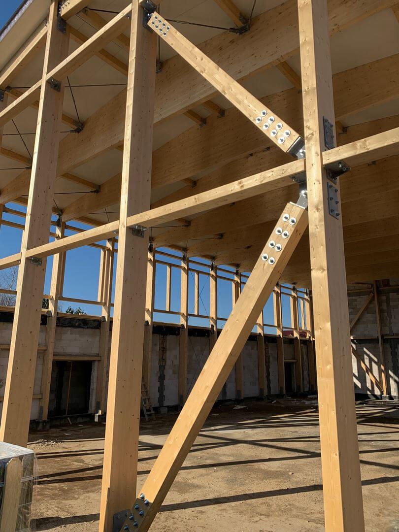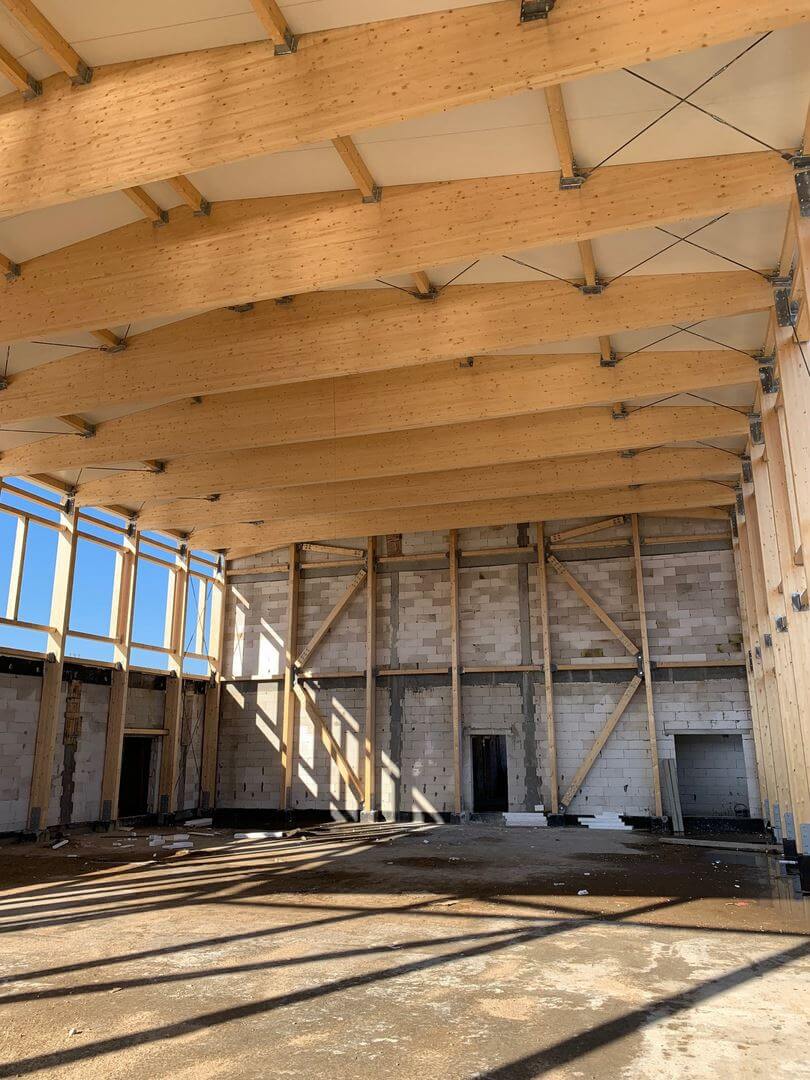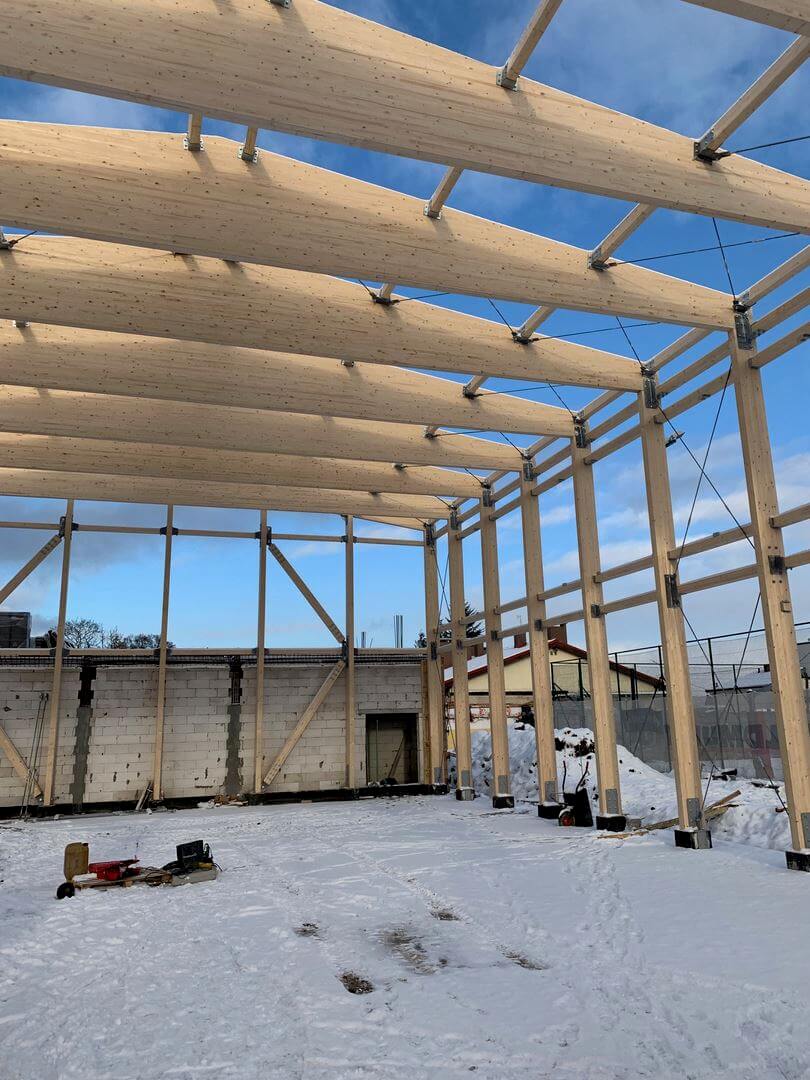 Konstrukcję nośną sali sportowej stanowią ramy z drewna klejonego połączone ze sobą płatwiami dachowymi oraz ryglami ściennymi. Przestrzenną stateczność obiektu zapewnia układ stężeń stalowych i drewnianych. Dźwigary połączone przegubowo ze słupami za pomocą okuć indywidualnych.