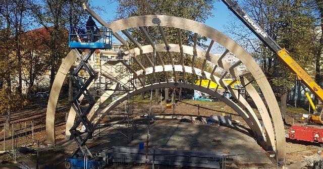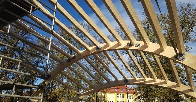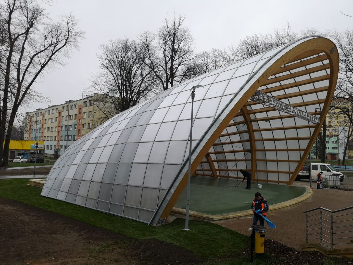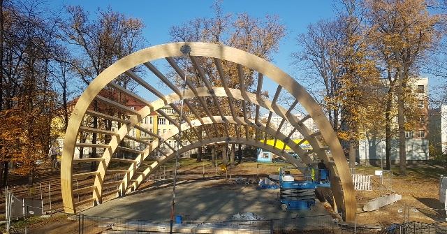 Projekt, dostawa i montaż konstrukcji drewnianej zadaszenia Sceny Amfiteatru w Parku Miejskim w Bolesławcu. Główną konstrukcję nośną stanowią dźwigary łukowe z drewna klejonego w zmiennym rozstawie osiowym. Dźwigary połączone są z fundamentem za pomocą indywidualnych łączników oraz marek stalowych. Dopełnienie konstrukcji stanowią płatwie dachowe połączone przegubowo z dźwigarami