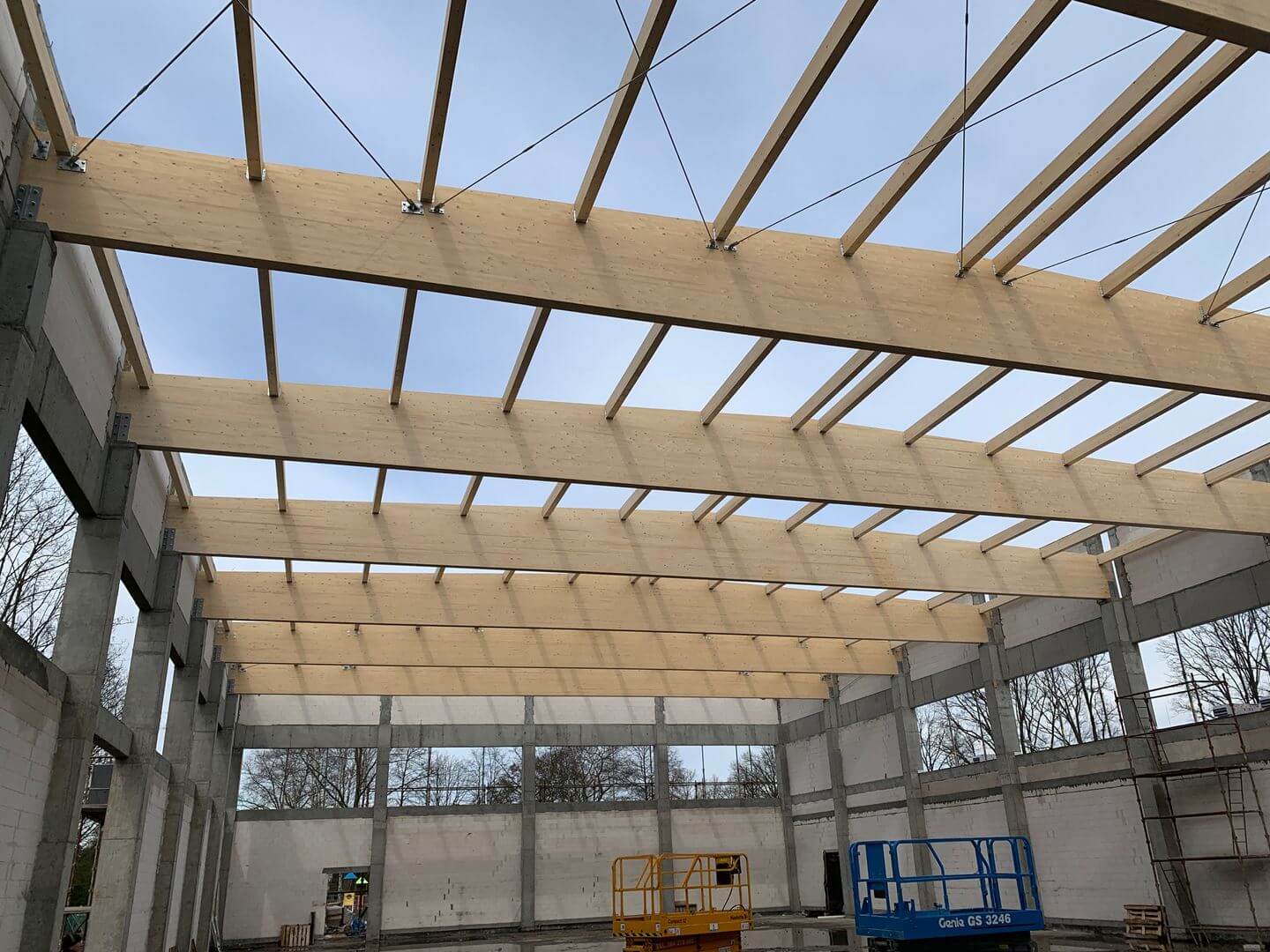 Projekt, dostawa i montaż konstrukcji dachu dla budynku hali sportowej przy Szkole Podstawowej w Borui Kościelnej. Konstrukcja dwuspadowego dachu składa się z dźwigarów dwutrapezowych, na których opierają się płatwie. Zarówno dźwigary jak i płatwie pracują w schemacie belek wolnopodpartych.