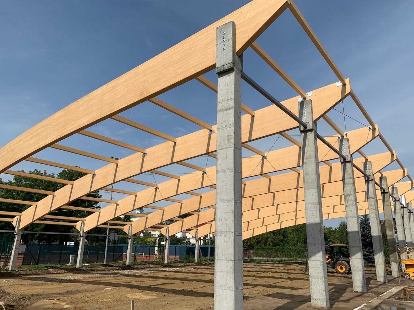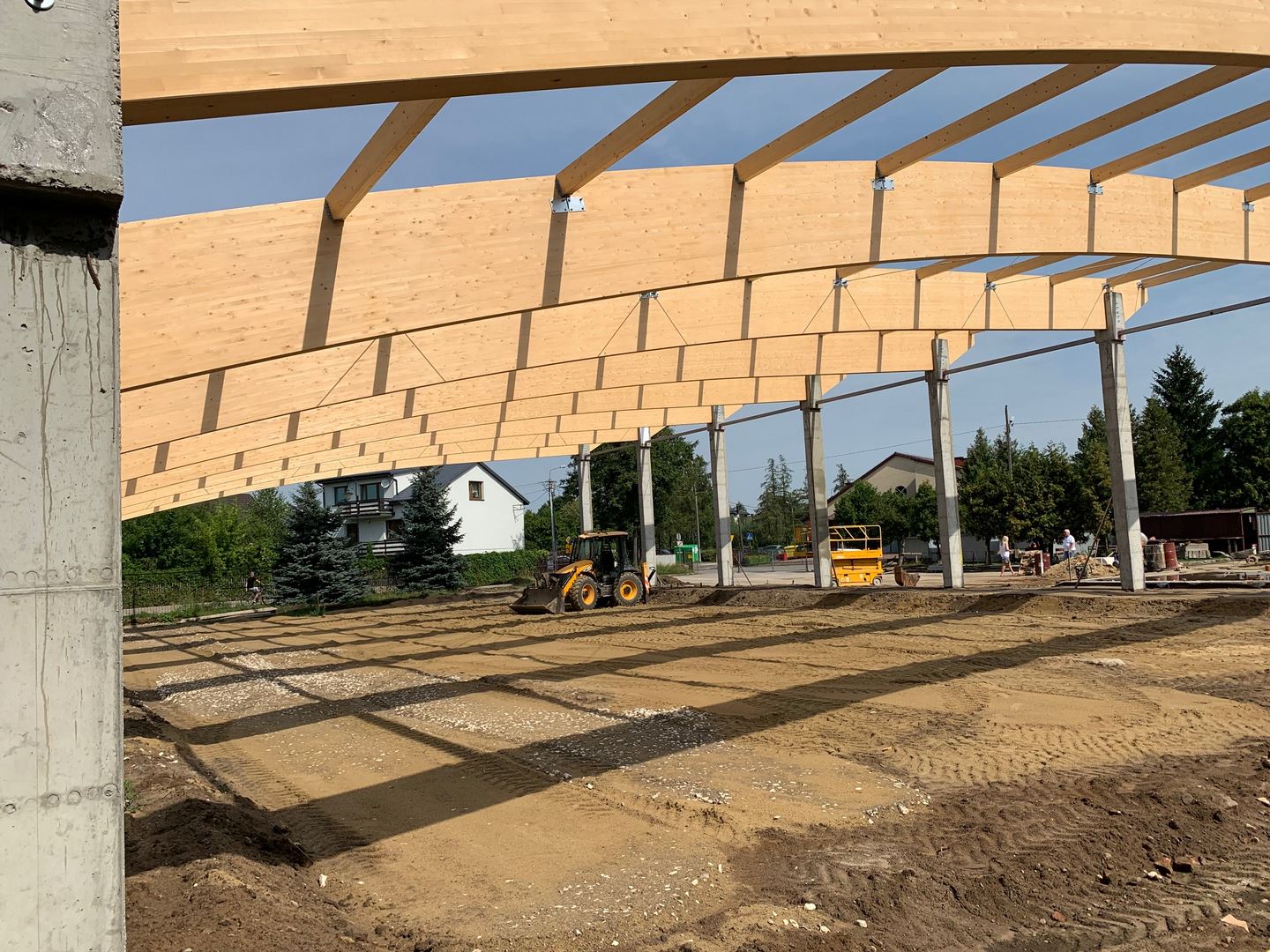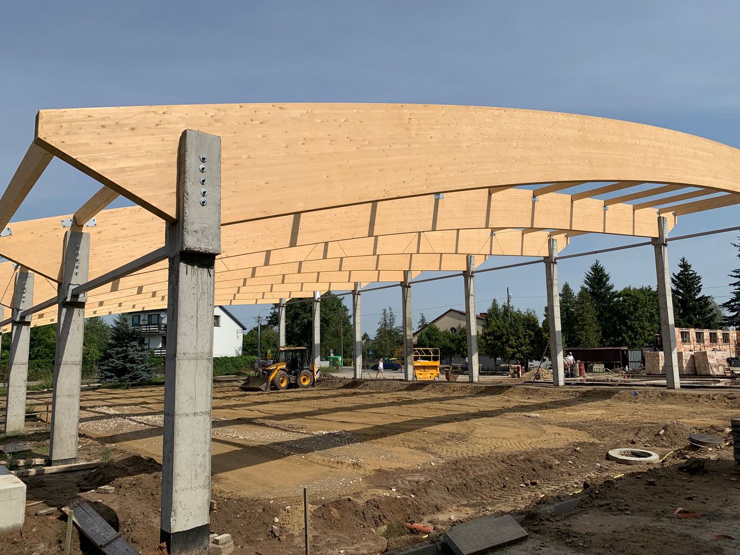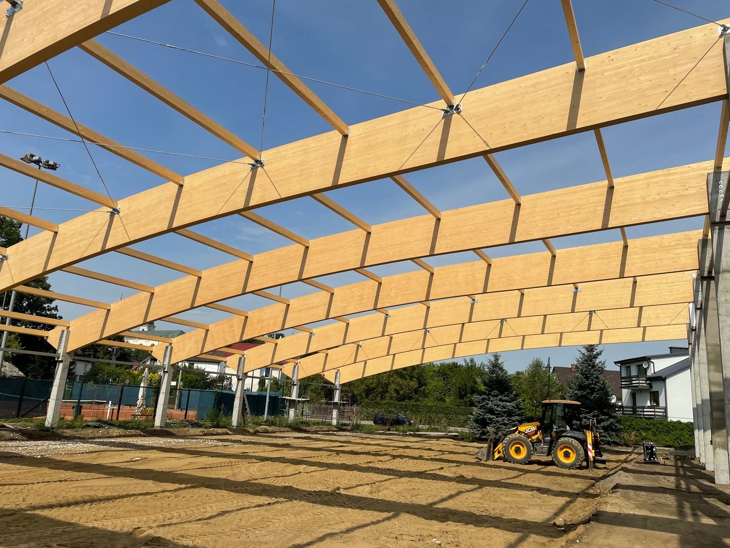 Zadaszenie lodowiska sezonowego w Garwolinie. Dźwigary pracują w schemacie belki wolnopodpartej. Konstrukcja usztywniona przez stalowe, prętowe stężenia i płatwie. Efekty pracy całego zespołu można zobaczyć na załączonych fotografiach.