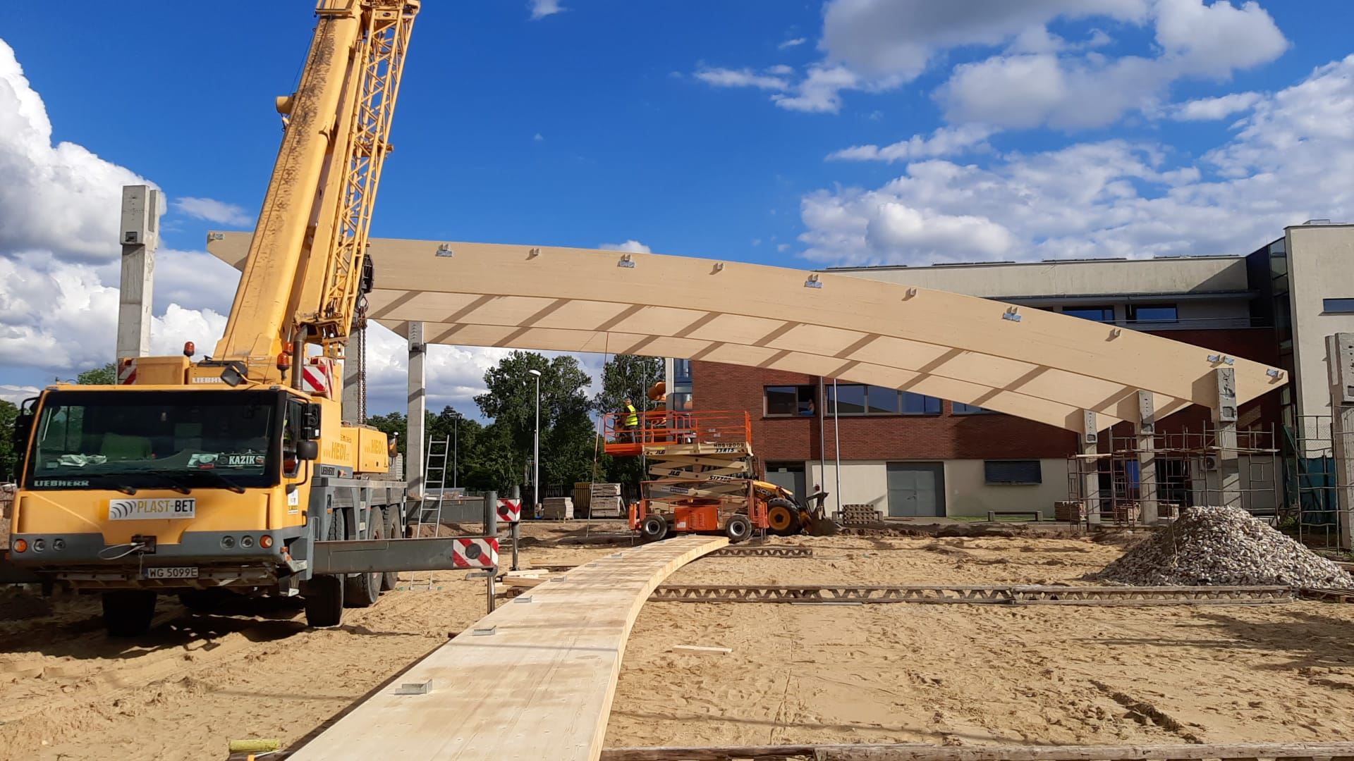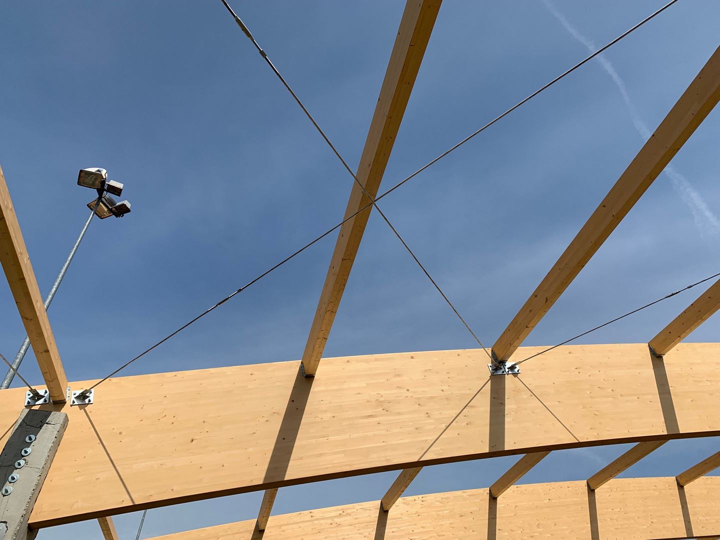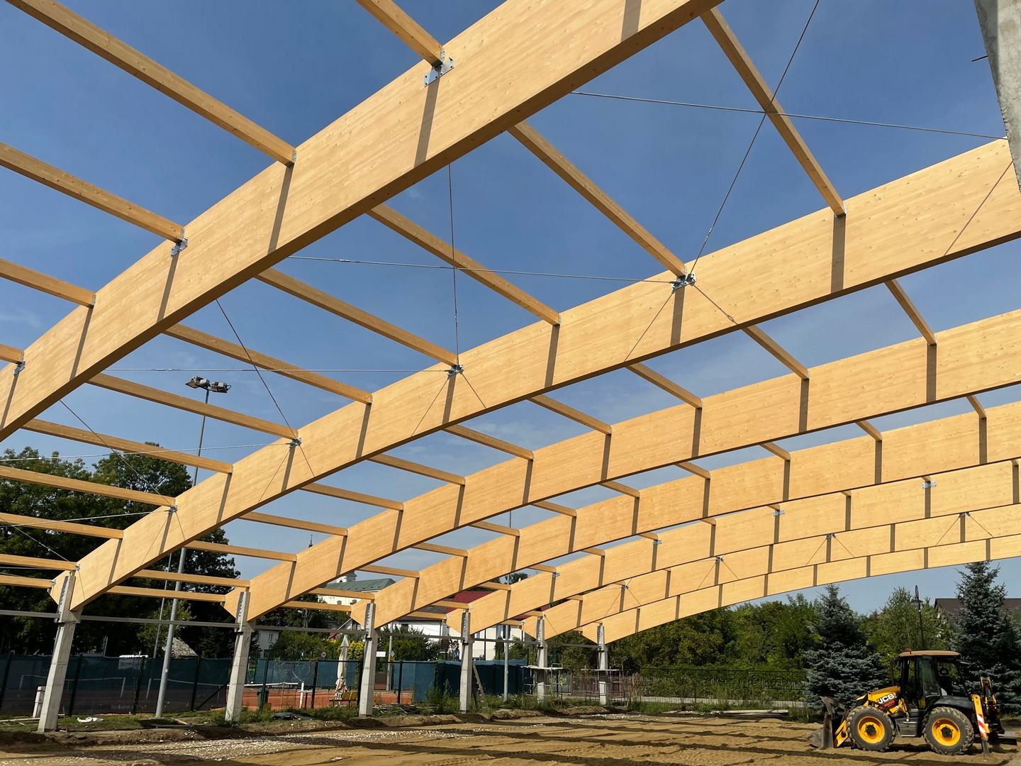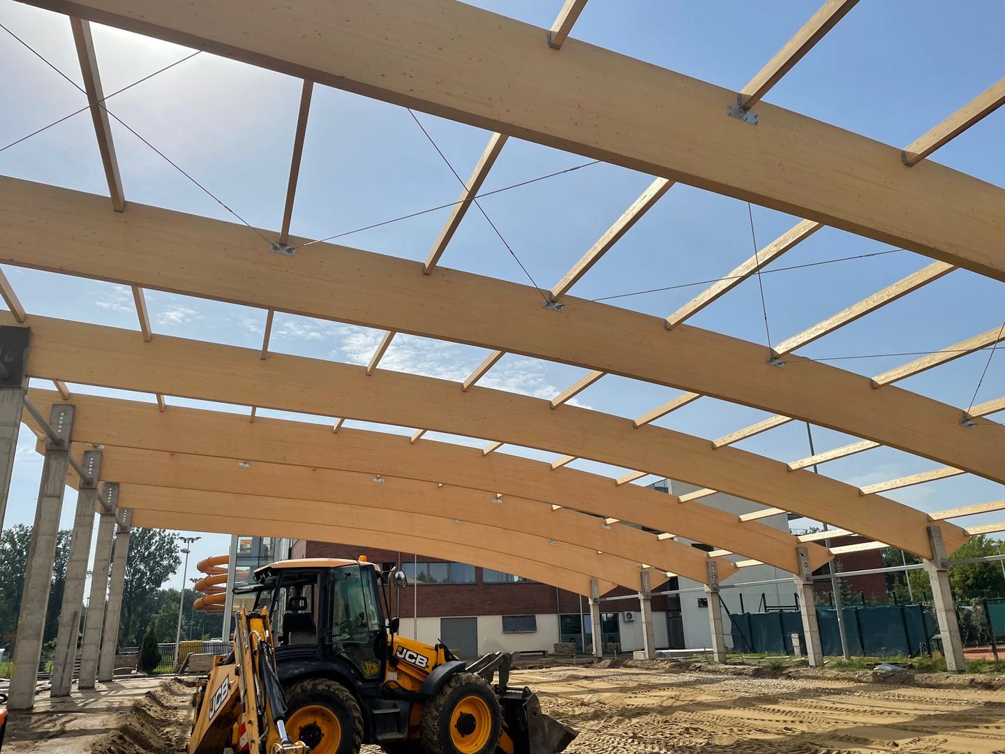 Zadaszenie lodowiska sezonowego w Garwolinie. Dźwigary pracują w schemacie belki wolnopodpartej. Konstrukcja usztywniona przez stalowe, prętowe stężenia i płatwie. Efekty pracy całego zespołu można zobaczyć na załączonych fotografiach.