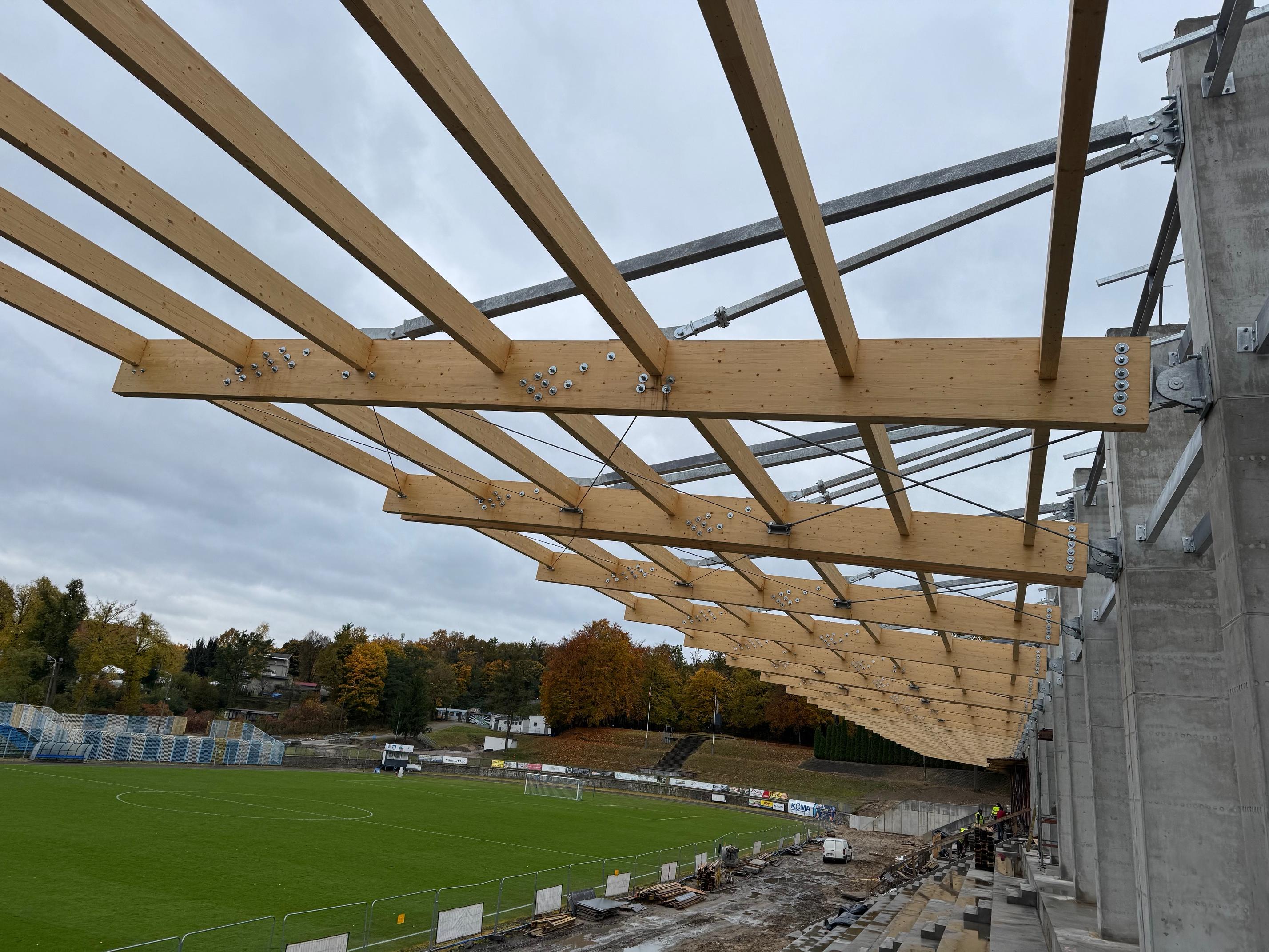Główną konstrukcję nośną stanowią dźwigary proste połączone z wieszakami stalowymi o przekroju prostokątnym. Dźwigary są połączone przegubowo na słupach żelbetowych przy pomocy okuć indywidulanych mocowanych.