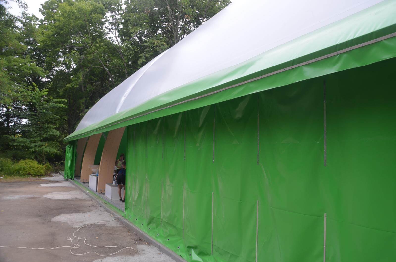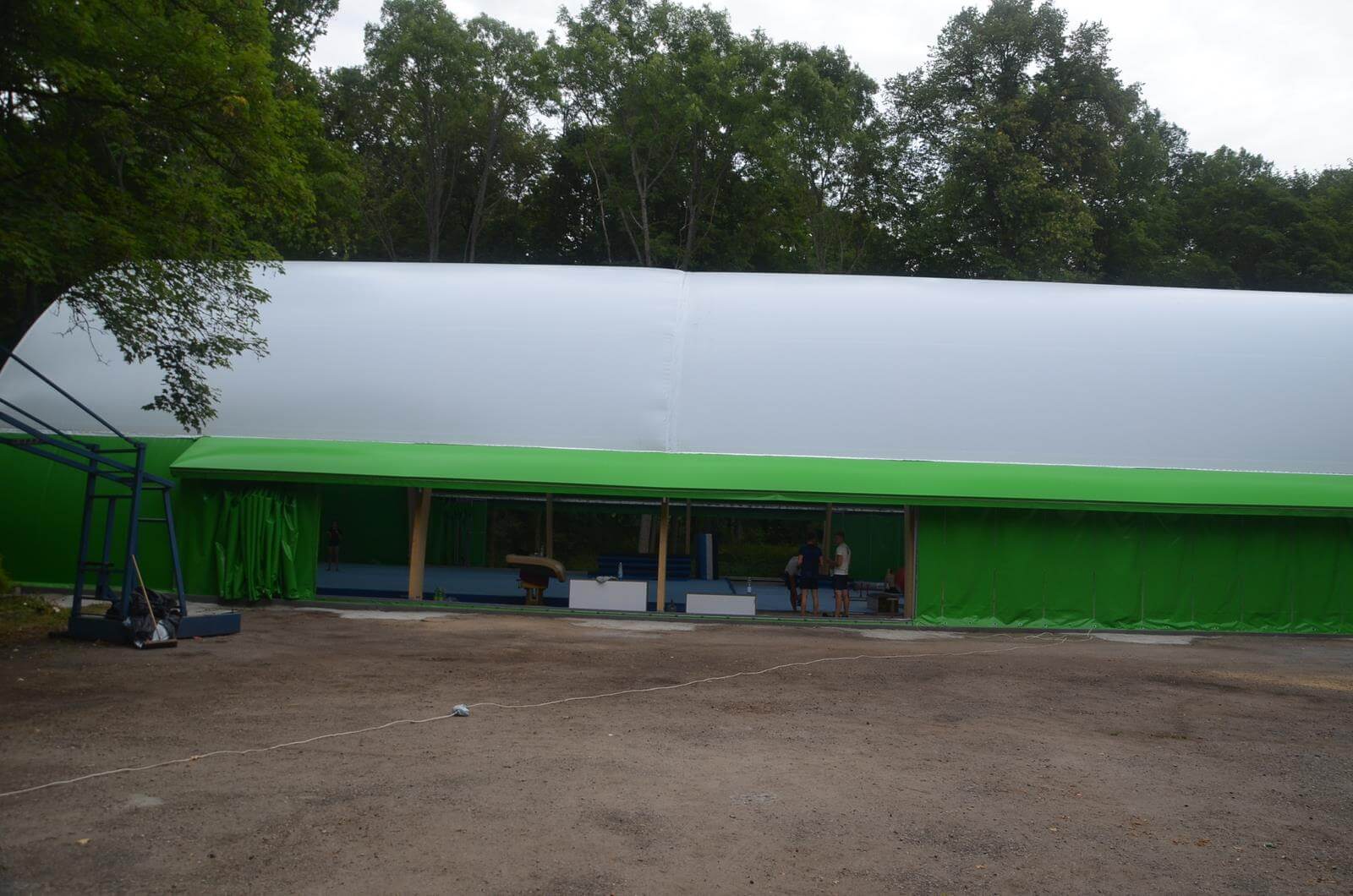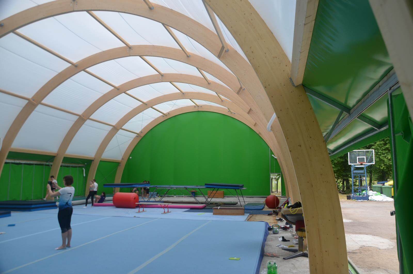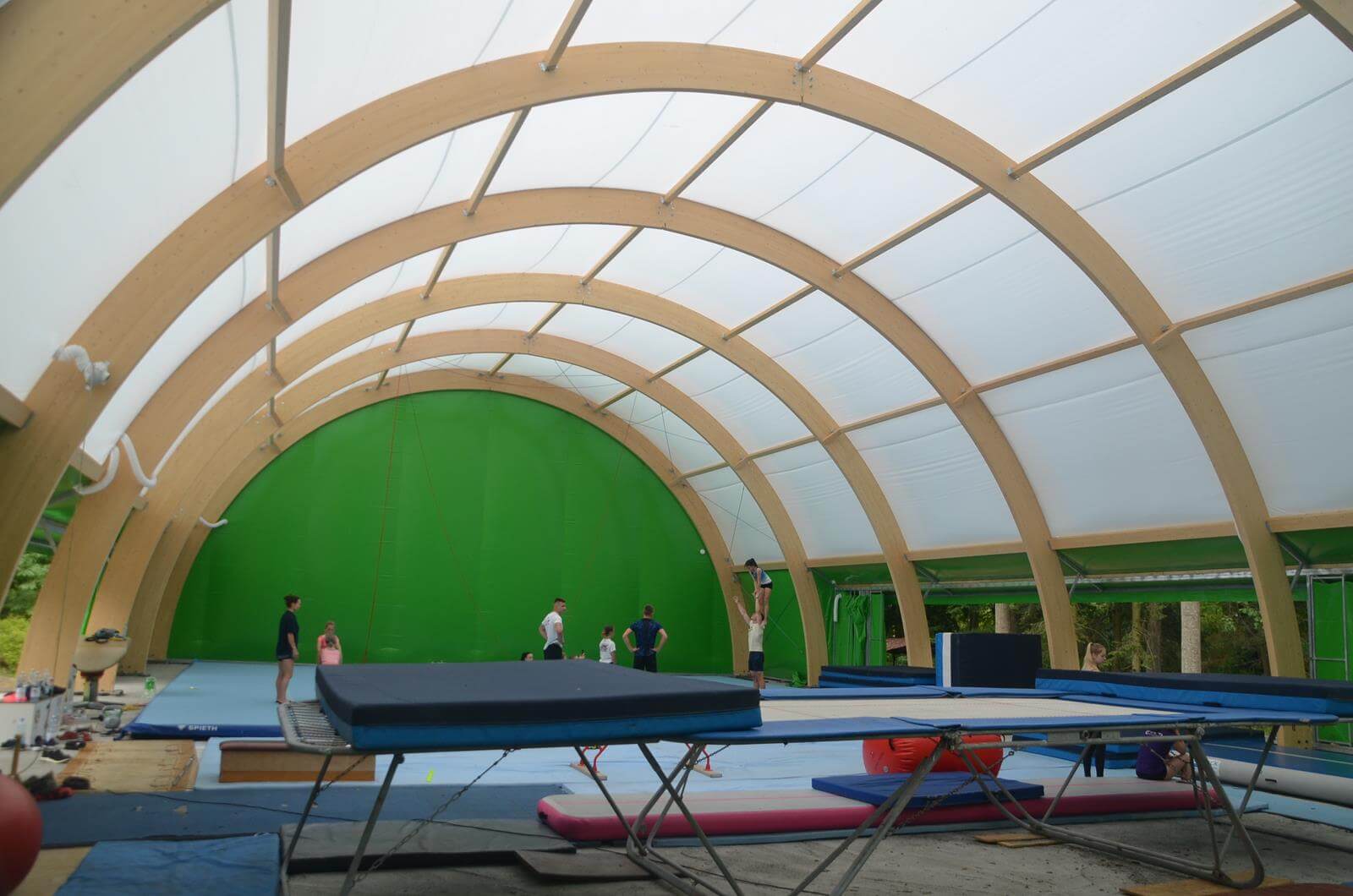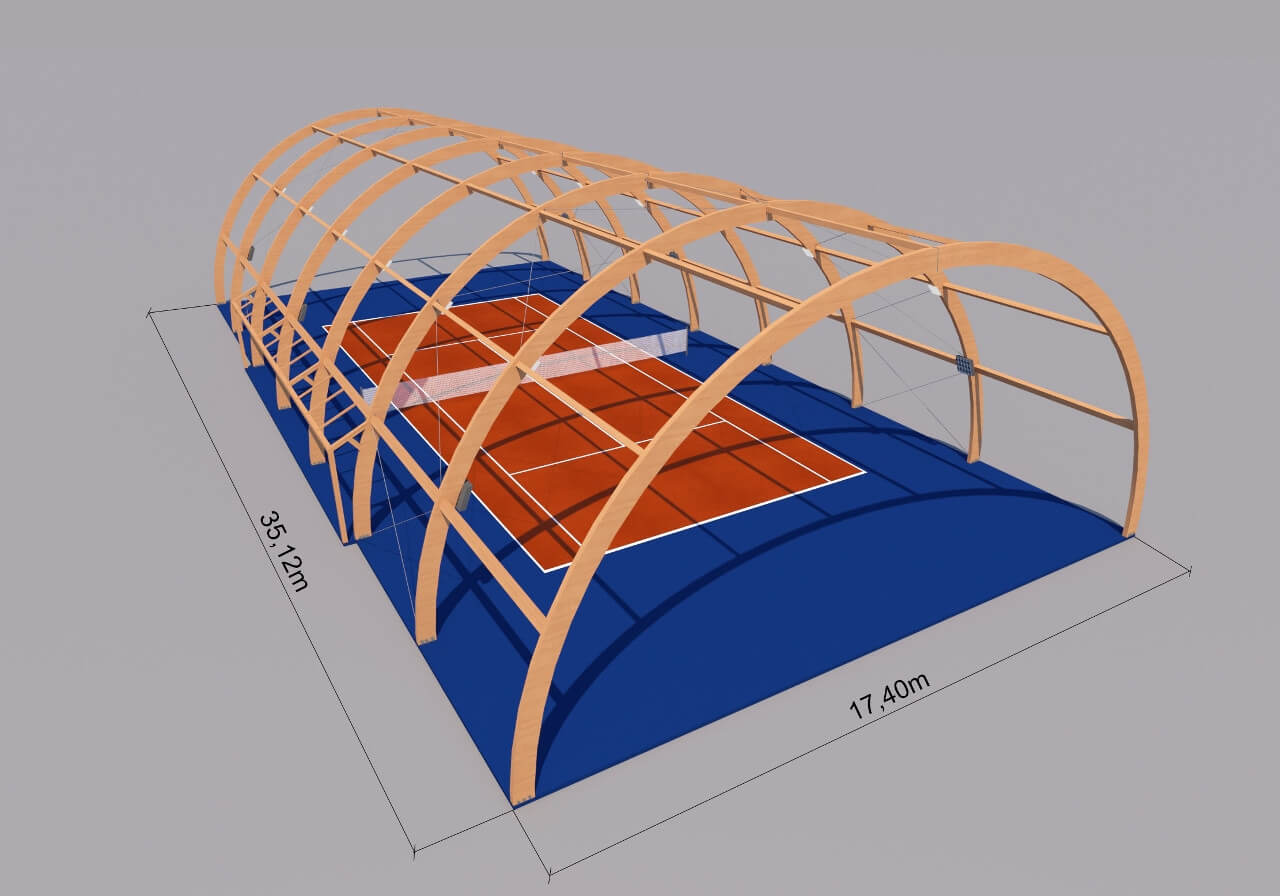 Konstrukcja kortu jest wykonana w technologii drewna klejonego z wykorzystaniem dźwigarów łukowych. Układ konstrukcyjny hali to 8 trójprzegubowych dźwigarów z drewna klejonego w klasie GL28c oraz GL24h dla pozostałych elementów z drewna klejonego. Układ uzupełniony jest dodatkowo o tężniki drewniane i stężenia stalowe, które zapewniają usztywnienie elementów głównych i prawidłową pracę przestrzenną konstrukcji.