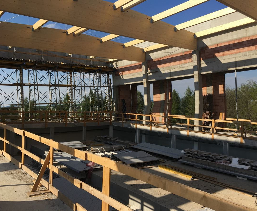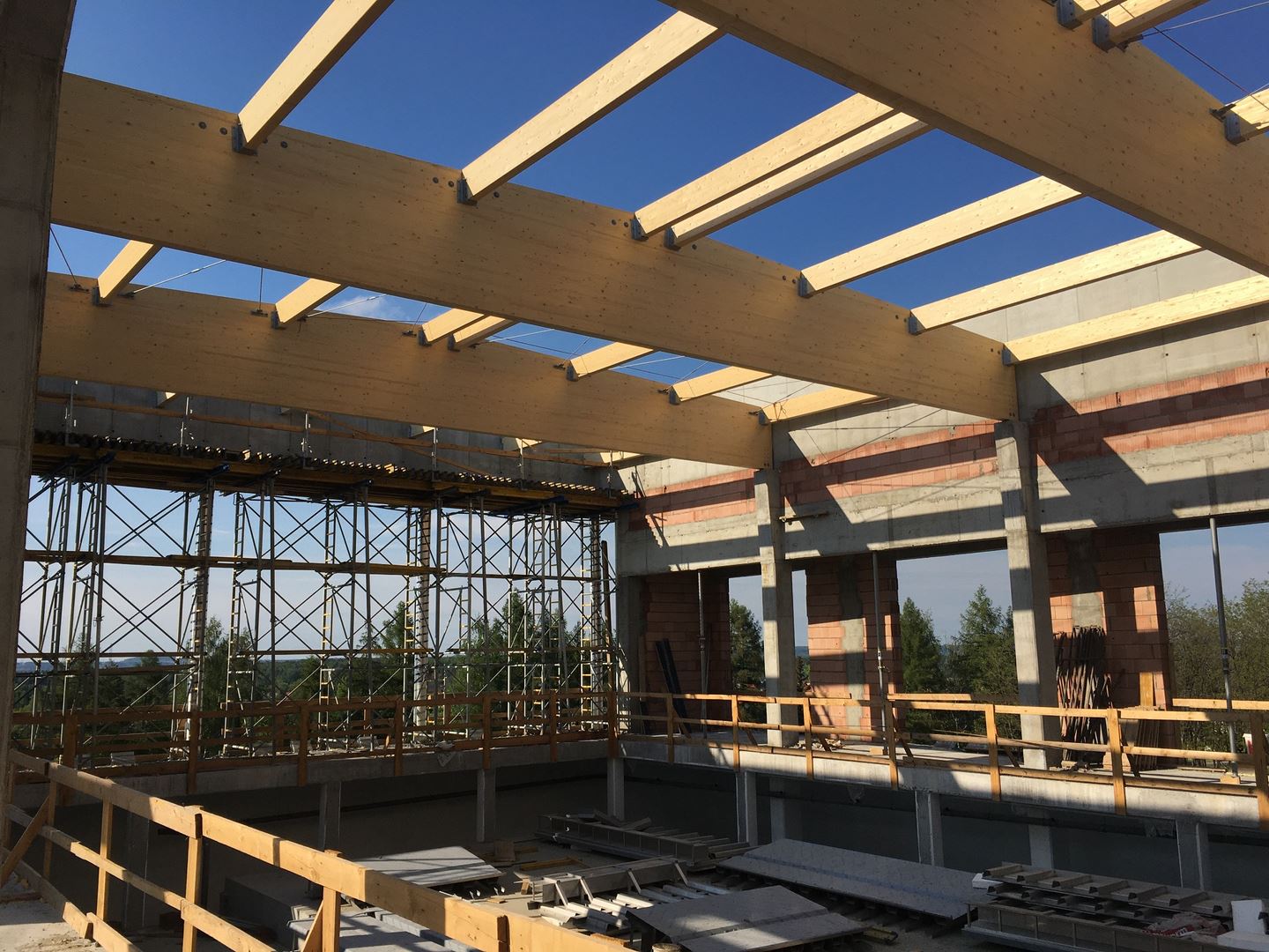 Główną konstrukcję nośną stanowią dźwigary z drewna klejonego o kształcie dwutrapezowym oraz trapezowym. Dopełnienie konstrukcji stanowią płatwie dachowe jednoprzęsłowe połączone przegubowo z dźwigarami i połączone do wieńców ścian szczytowych. W celu usztywnienia konstrukcji zaprojektowano układ stężeń połaciowych z prętów okrągłych.