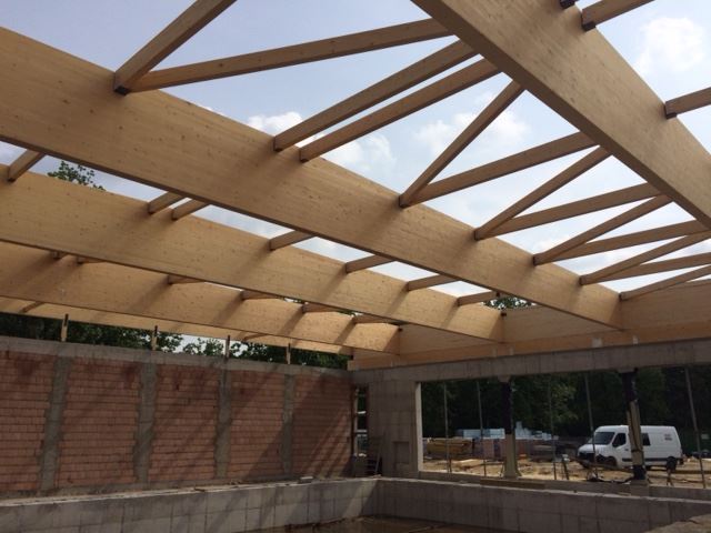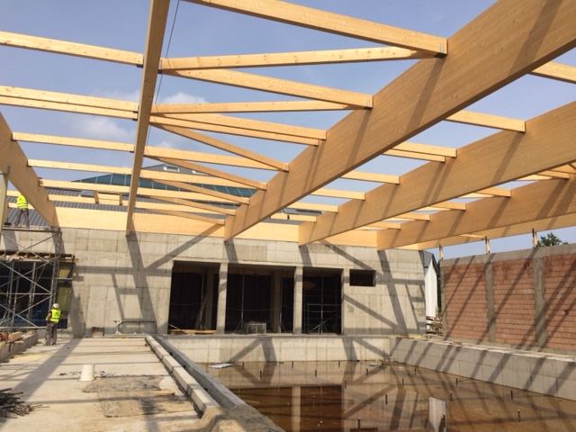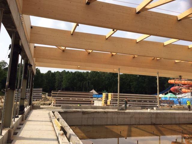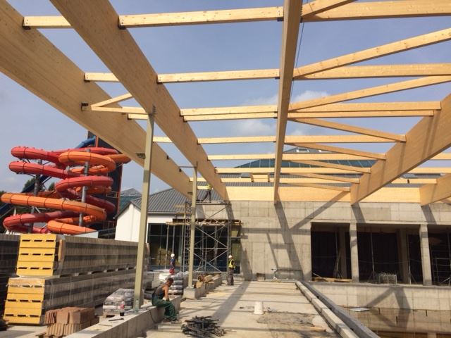 Kompleksowa obsługa w zakresie projektowania, dostawy i montażu konstrukcji dachu na obiekcie Aquapark w Łodzi, przy Al. Unii Lubelskiej. Wymiary obiektu: 31 m x 25,7 m Główne elementy konstrukcji dachu to dźwigary dwutrapezowe oraz płatwie i stężenia z drewna klejonego.