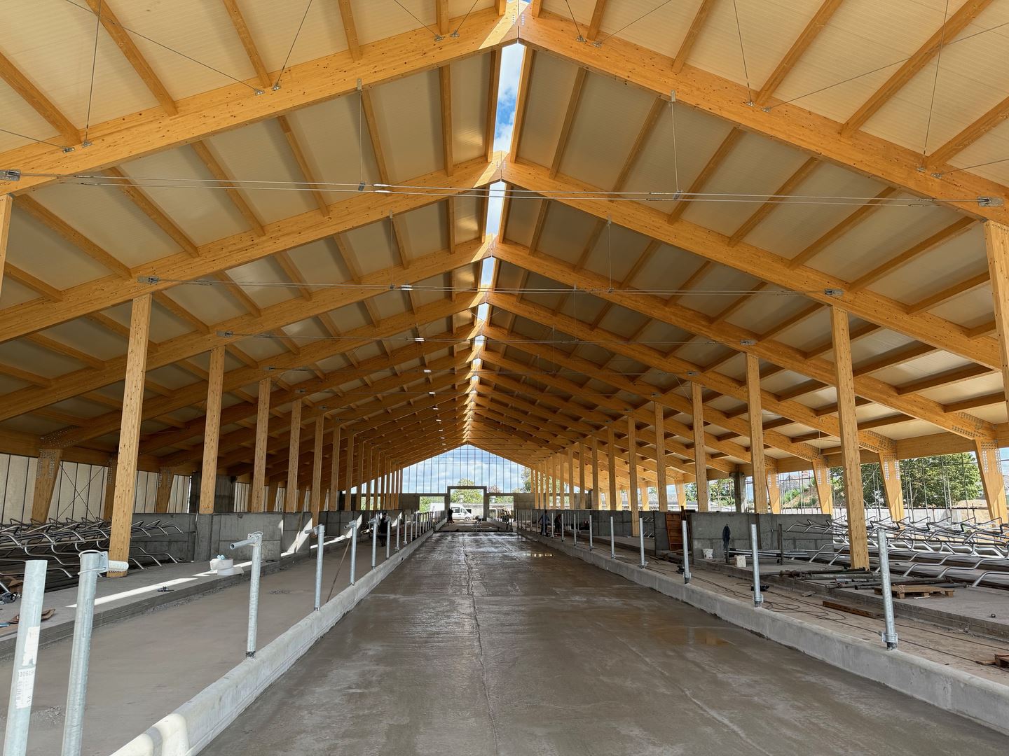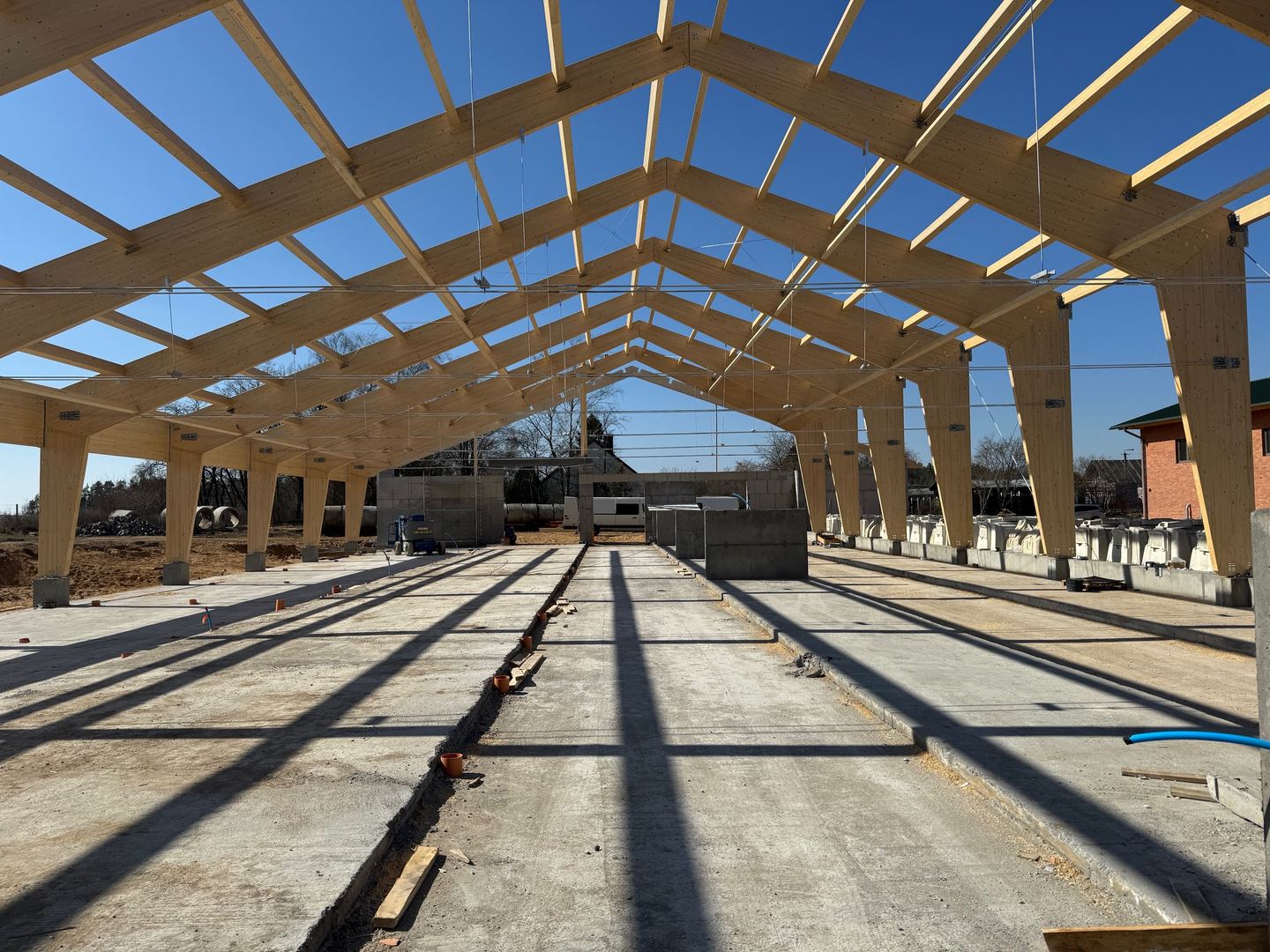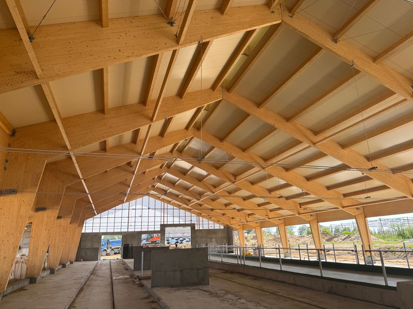 Kompleksowa obsługa w zakresie projektu, dostawy i montażu konstrukcji z drewna klejonego dla budynków obory, dojarni i łączników w miejscowości Lubań. Konstrukcję nośną obory stanowią ramowe układy z drewna klejonego oparte na fundamencie za pomocą stalowych okuć indywidulanych. Na obiekcie zastosowano okucia chowane. Przykład takiego połączenia jest widoczny na zdjęciach poniżej.