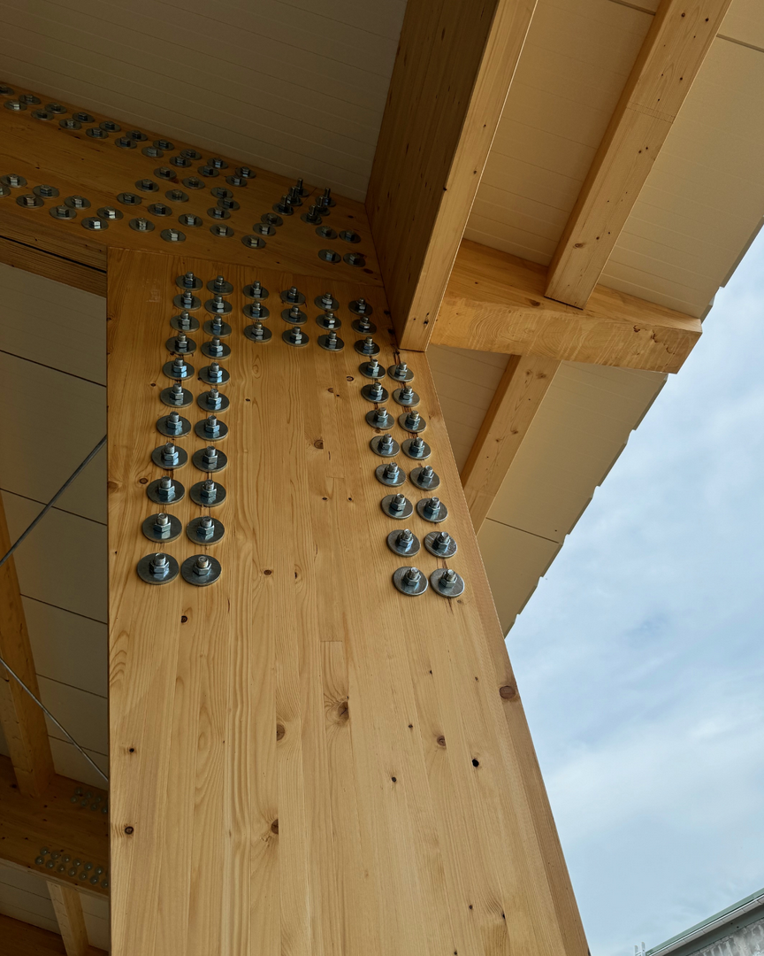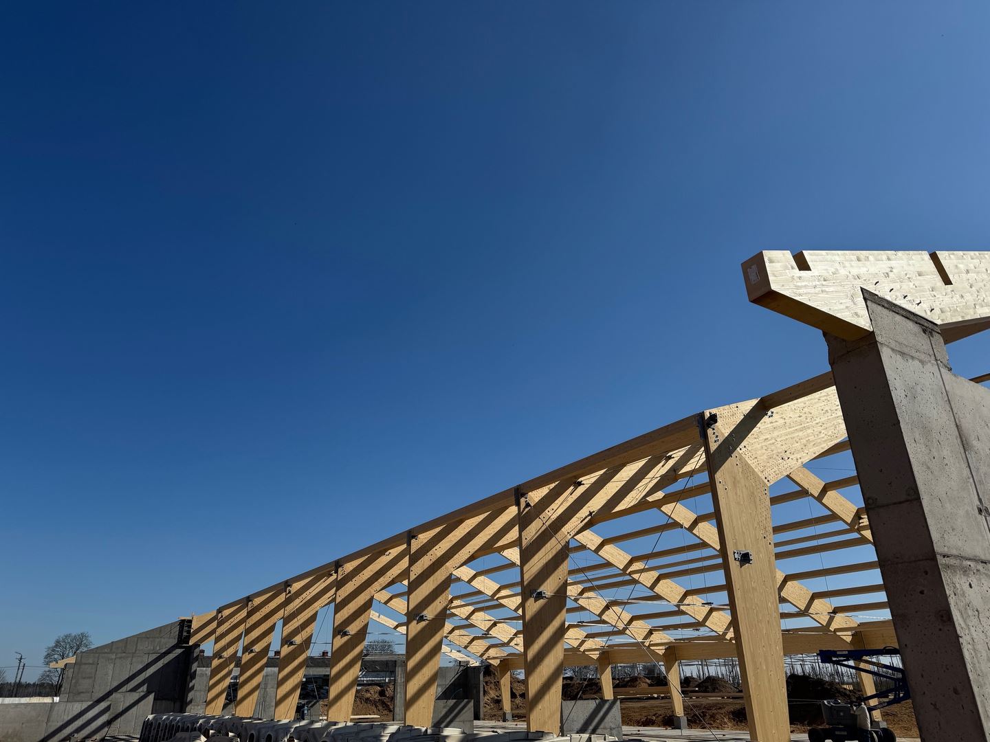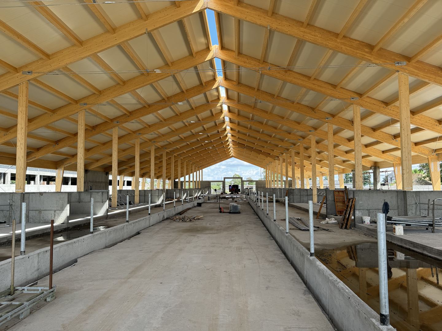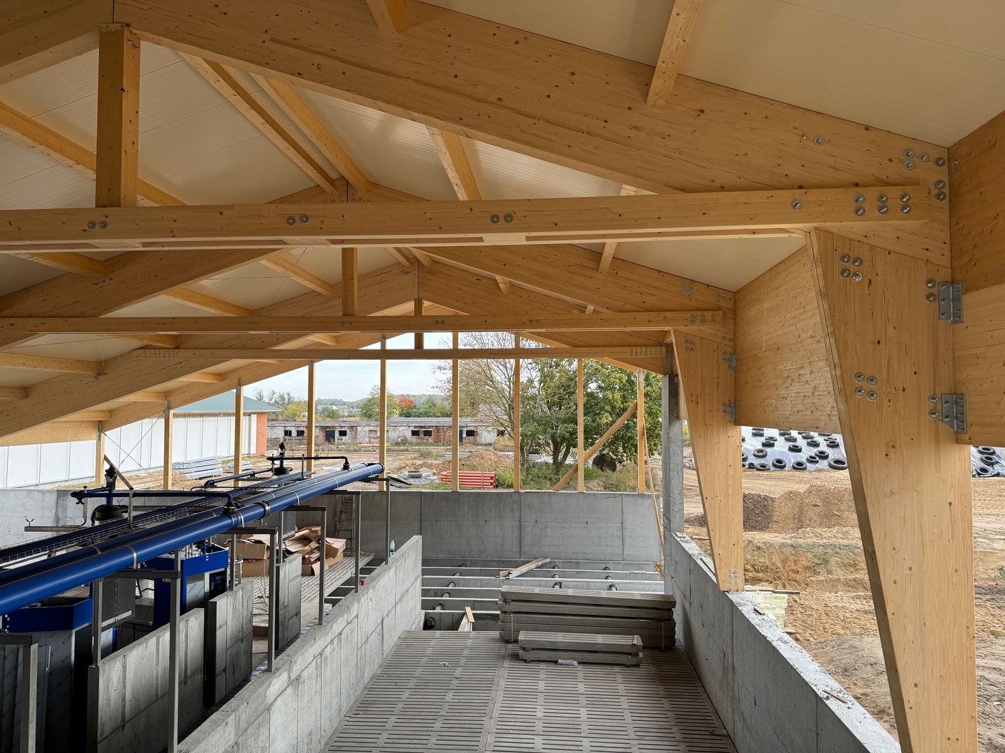 Kompleksowa obsługa w zakresie projektu, dostawy i montażu konstrukcji z drewna klejonego dla budynków obory, dojarni i łączników w miejscowości Lubań. Konstrukcję nośną obory stanowią ramowe układy z drewna klejonego oparte na fundamencie za pomocą stalowych okuć indywidulanych. Na obiekcie zastosowano okucia chowane. Przykład takiego połączenia jest widoczny na zdjęciach poniżej.