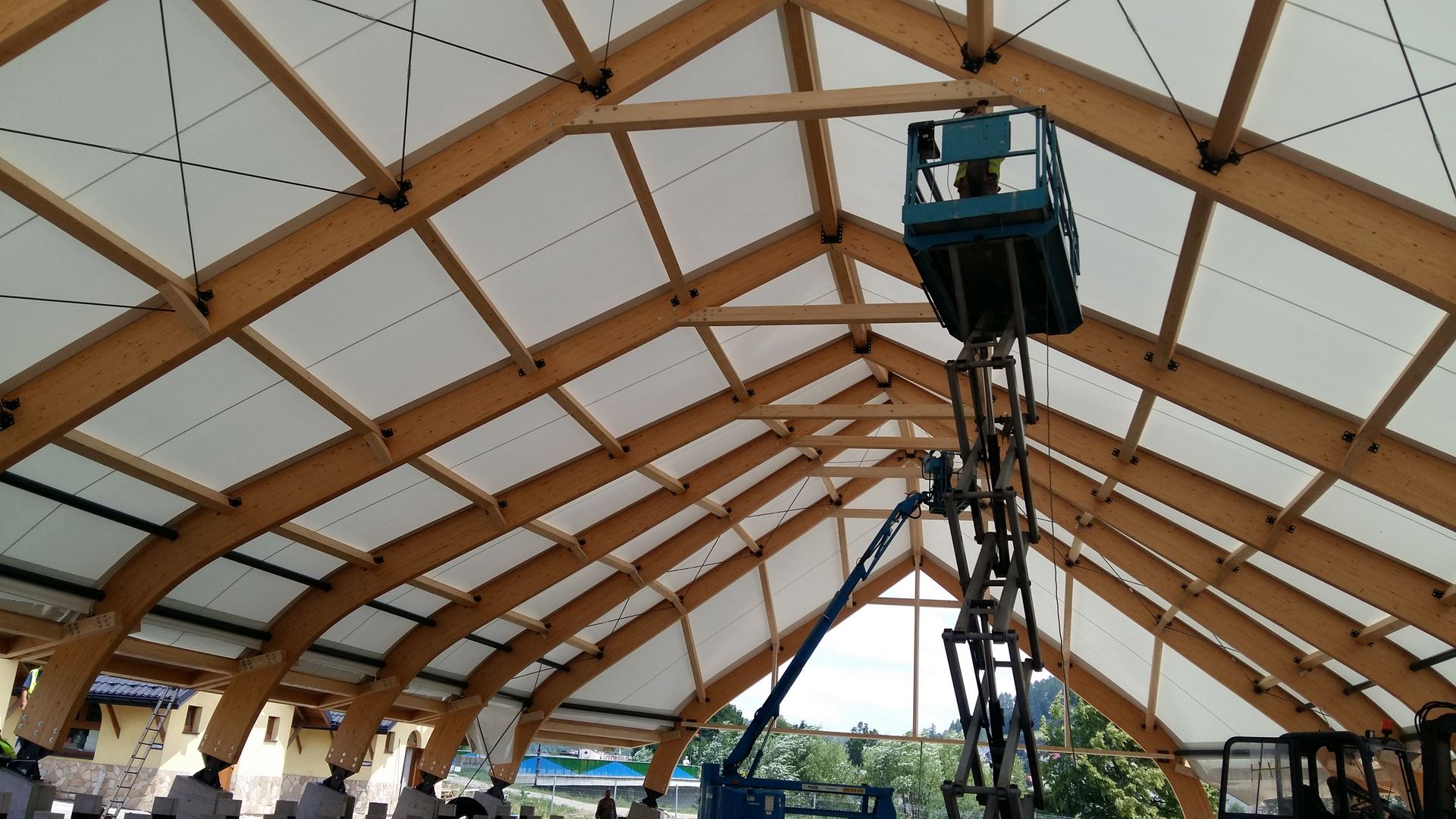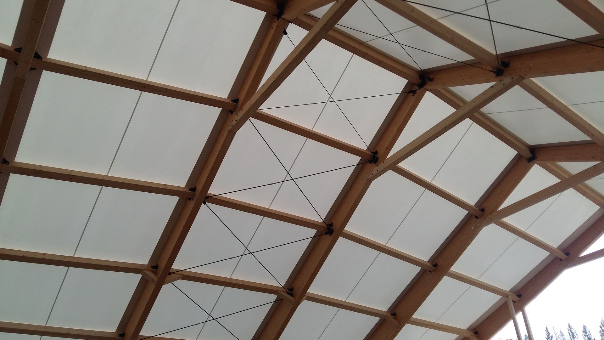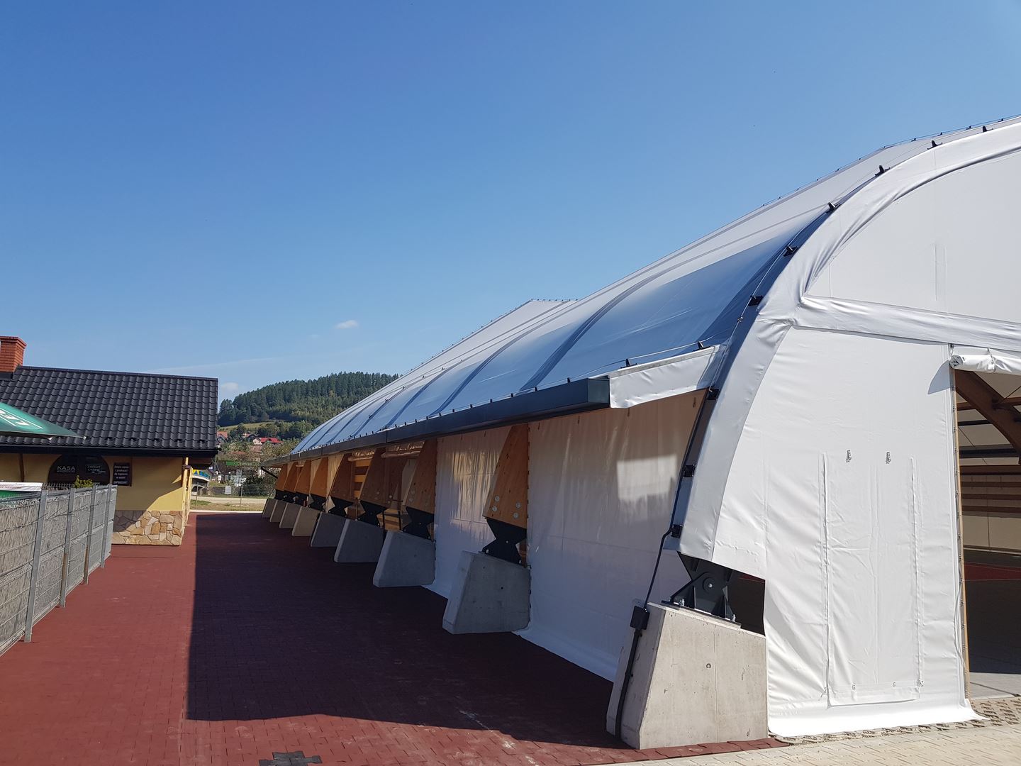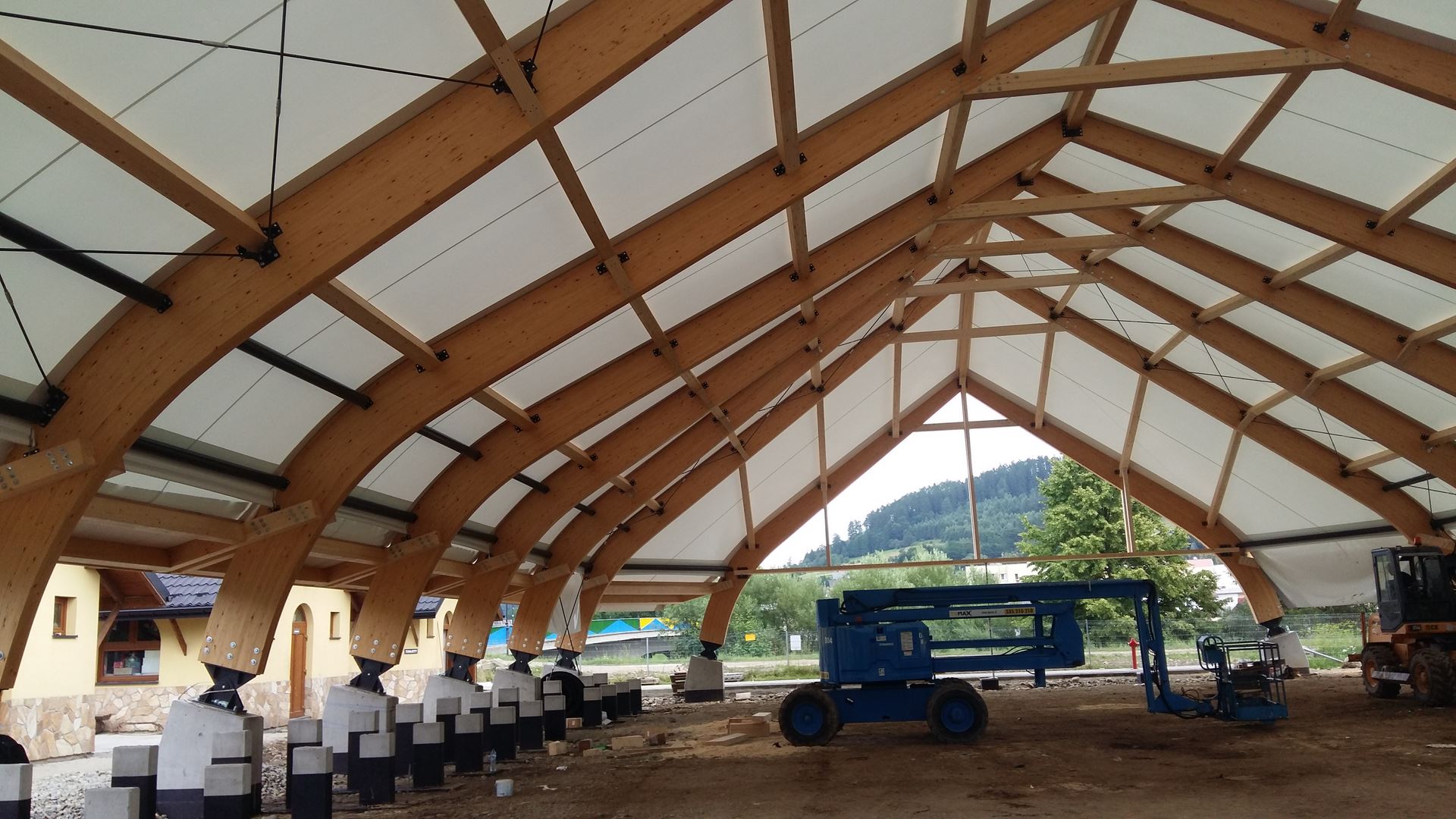 Konstrukcję zadaszenia stanowią dźwigary ramowe o zmiennej rozpiętości pokryte membraną PCV. Cała inwestycja obejmowała projekt, dostawę i montaż konstrukcji z drewna klejonego, natomiast pokrycie membraną bylo realizowane we współpracy z firmą Rekord Hale z Wrocławia.