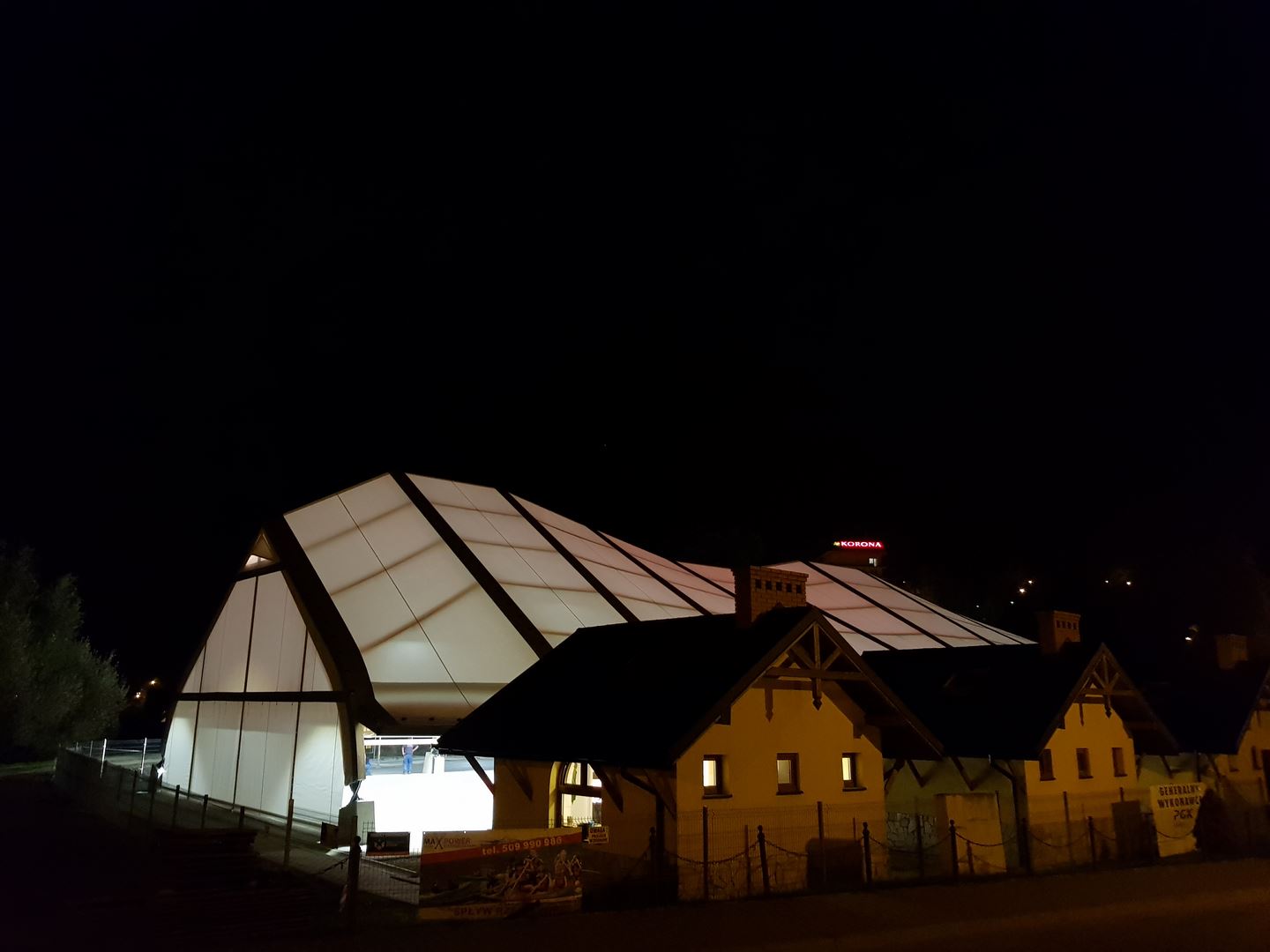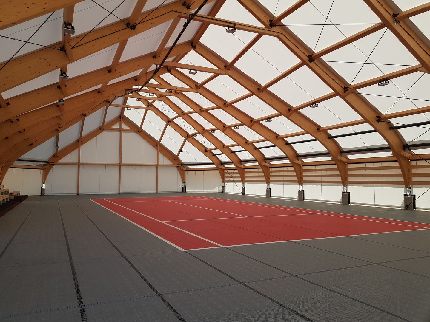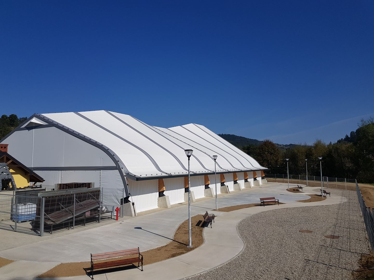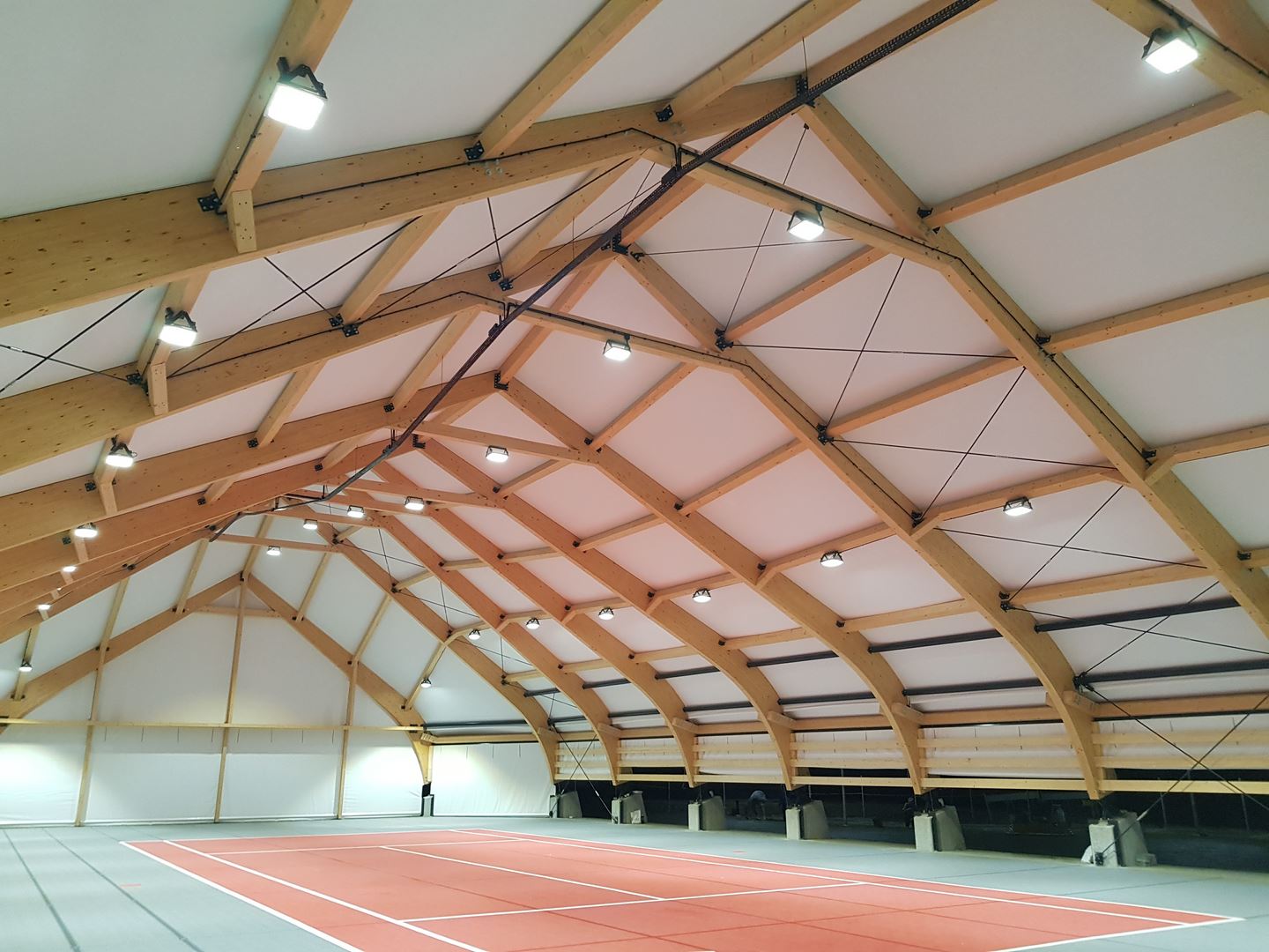 Konstrukcję zadaszenia stanowią dźwigary ramowe o zmiennej rozpiętości pokryte membraną PCV. Cała inwestycja obejmowała projekt, dostawę i montaż konstrukcji z drewna klejonego, natomiast pokrycie membraną bylo realizowane we współpracy z firmą Rekord Hale z Wrocławia.
