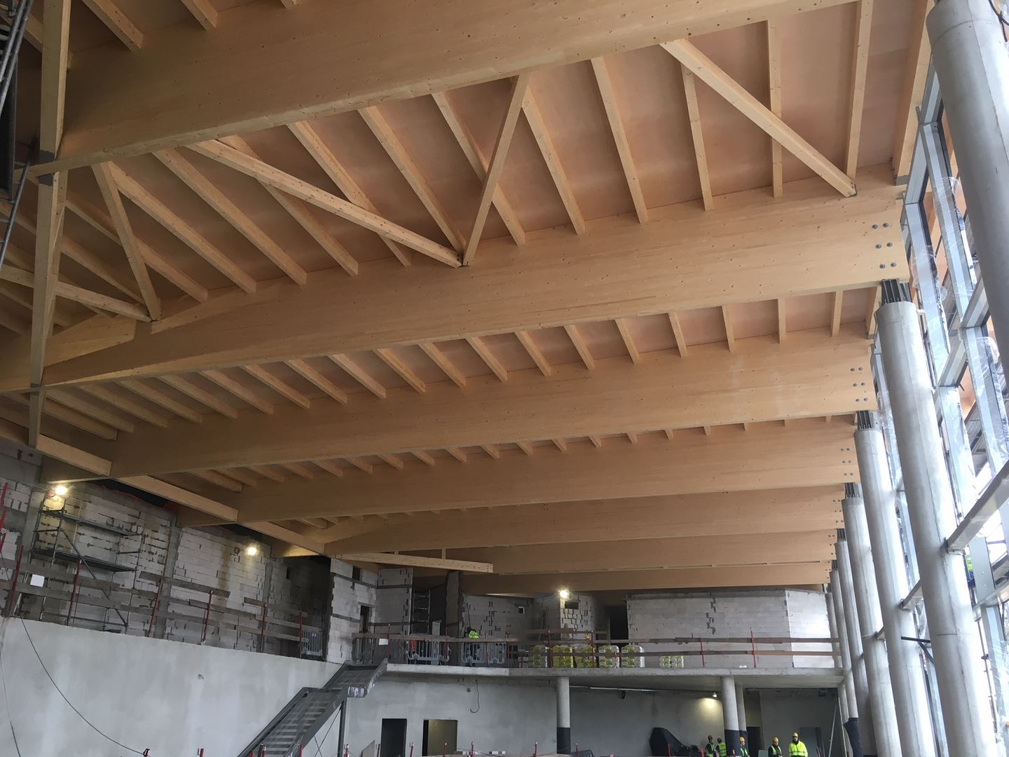 Główną konstrukcję nośną stanowią dźwigary z drewna klejonego z belek jednospadowych zaprojektowanych w klasie GL32h. Dopełnienie konstrukcji stanowią płatwie dachowe połączone przegubowo z dźwigarami. W celu usztywnienia konstrukcji zaprojektowano układ stężeń połaciowych z belek drewnianych.