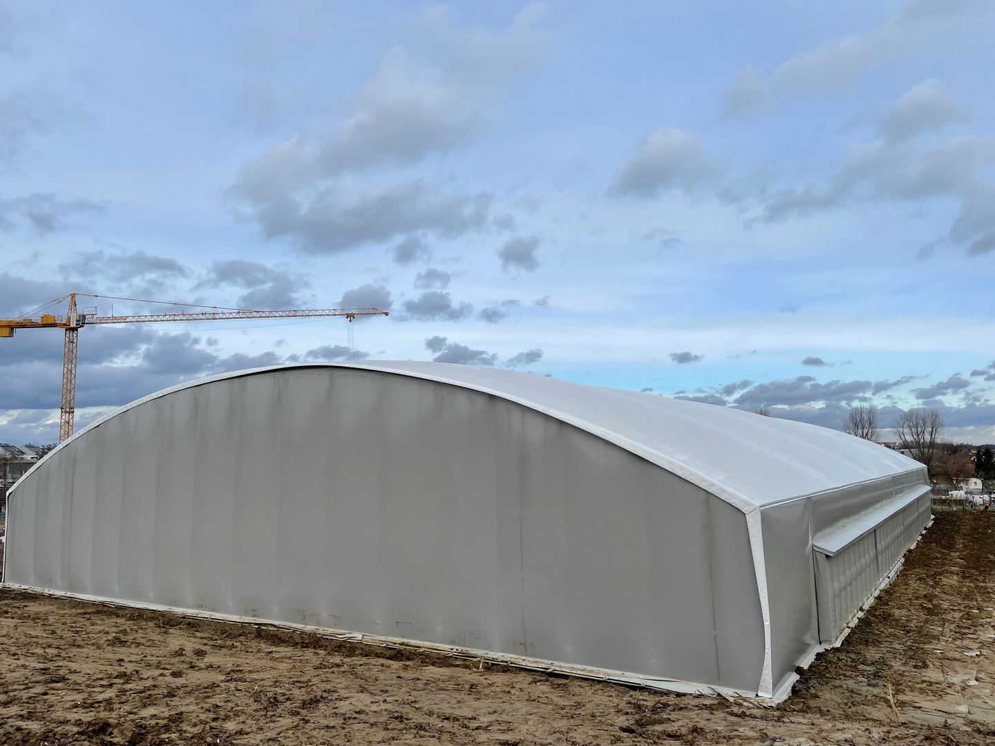 Konstrukcję hali stanowią elementy łukowe z drewna klejonego wraz z tężnikami i indywudualnymi okuciami stalowymi. Pokrycie hali stanowi podwójna trudnozaplana membrana PVC.