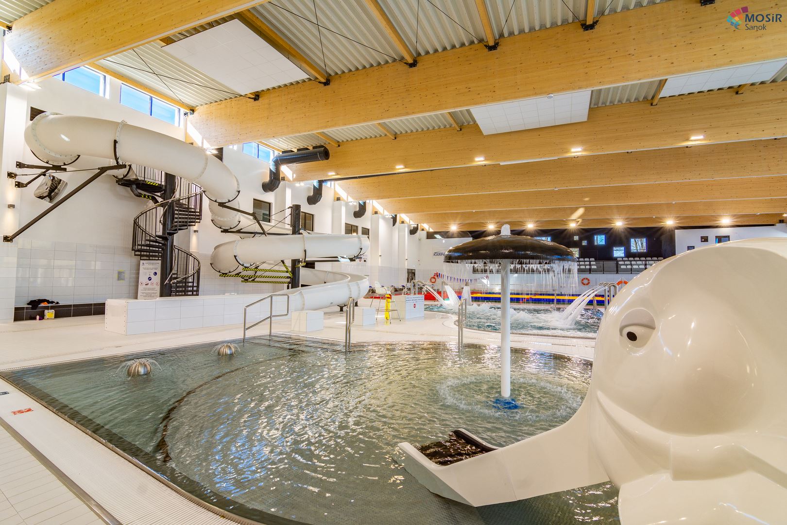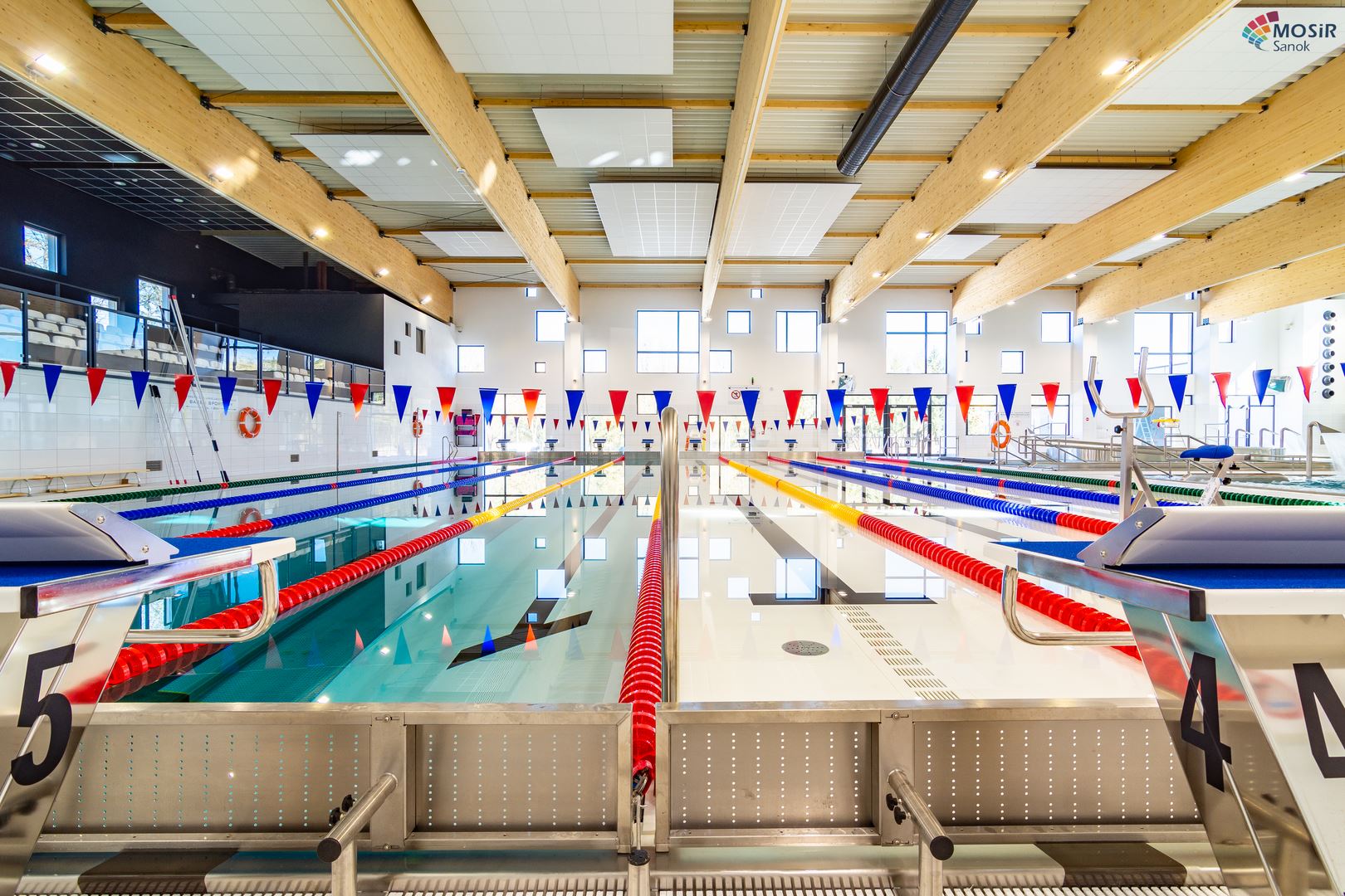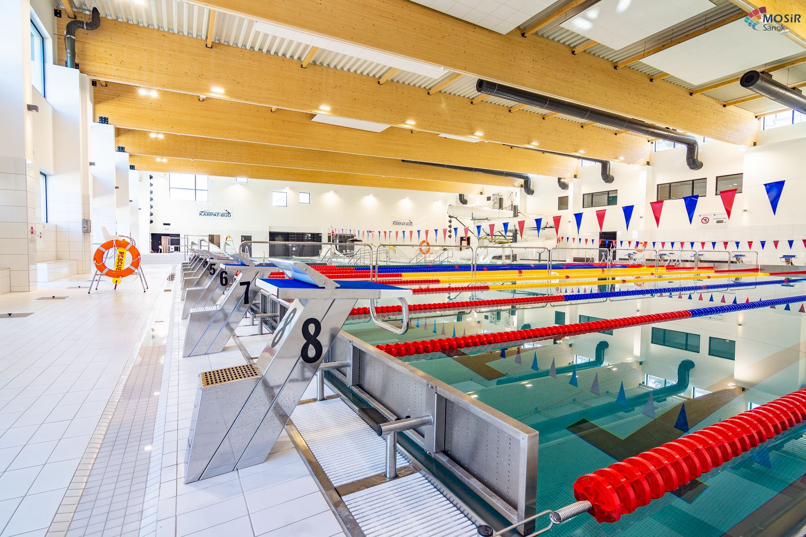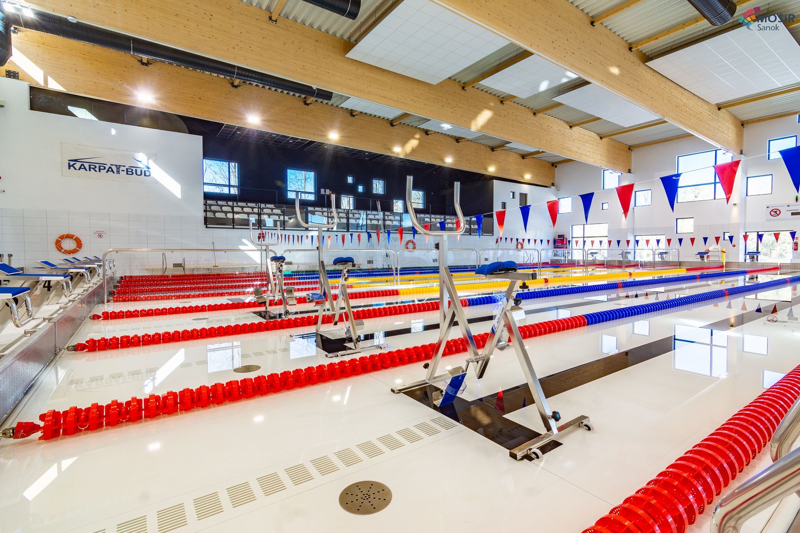 Główną konstrukcję nośną na basenie stanowią dźwigary z drewna klejonego w klasie GL32c ze wstępną strzałką ugięcia. Dopełnienie konstrukcji stanowią tężniki dachowe z drewna KVH w klasie C24. Zdjęcia zostały udostępnione przez MOSiR w Sanoku.
