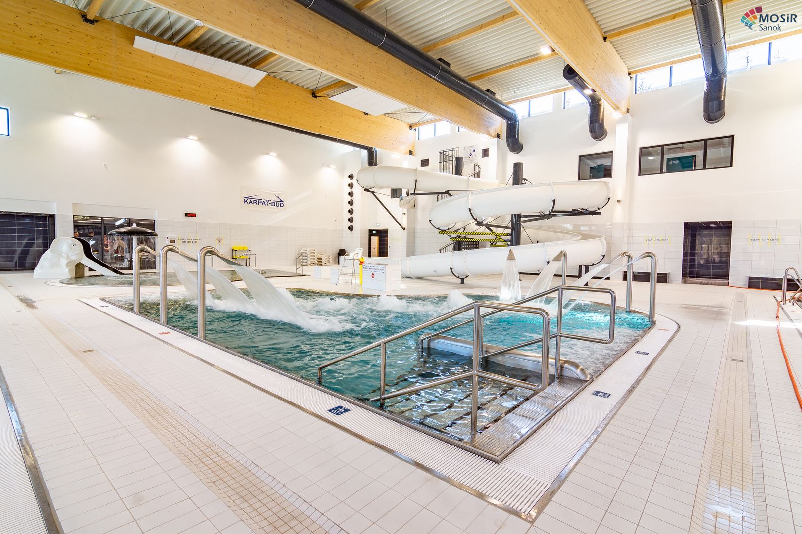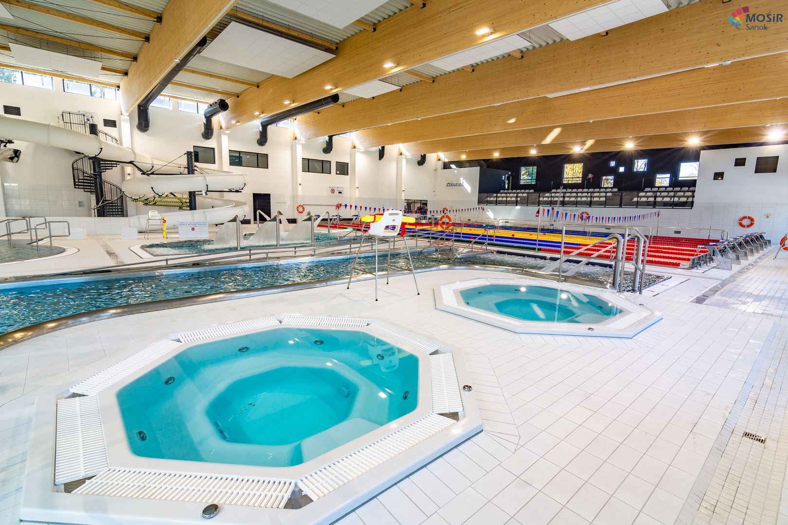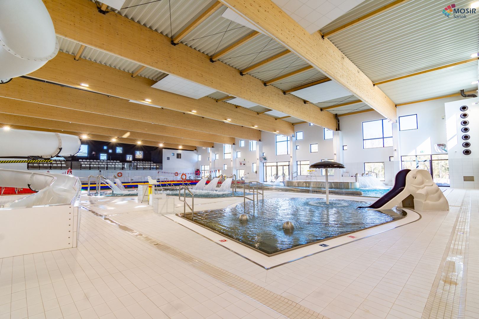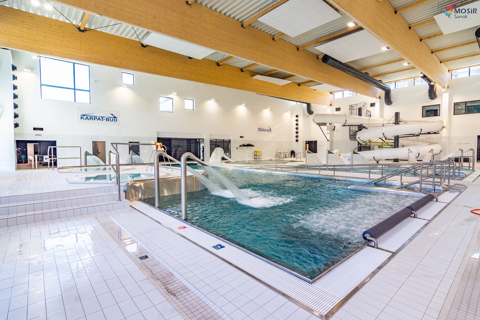 Główną konstrukcję nośną na basenie stanowią dźwigary z drewna klejonego w klasie GL32c ze wstępną strzałką ugięcia. Dopełnienie konstrukcji stanowią tężniki dachowe z drewna KVH w klasie C24. Zdjęcia zostały udostępnione przez MOSiR w Sanoku.