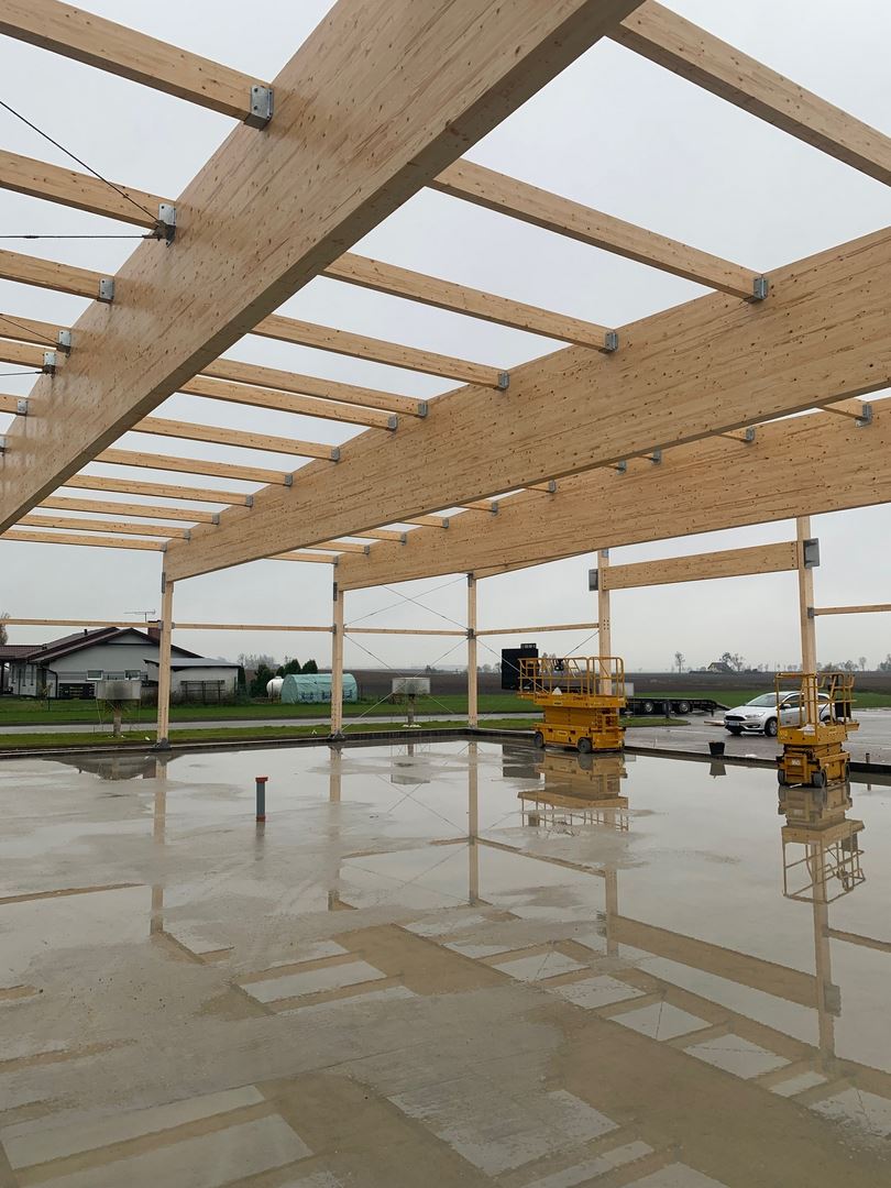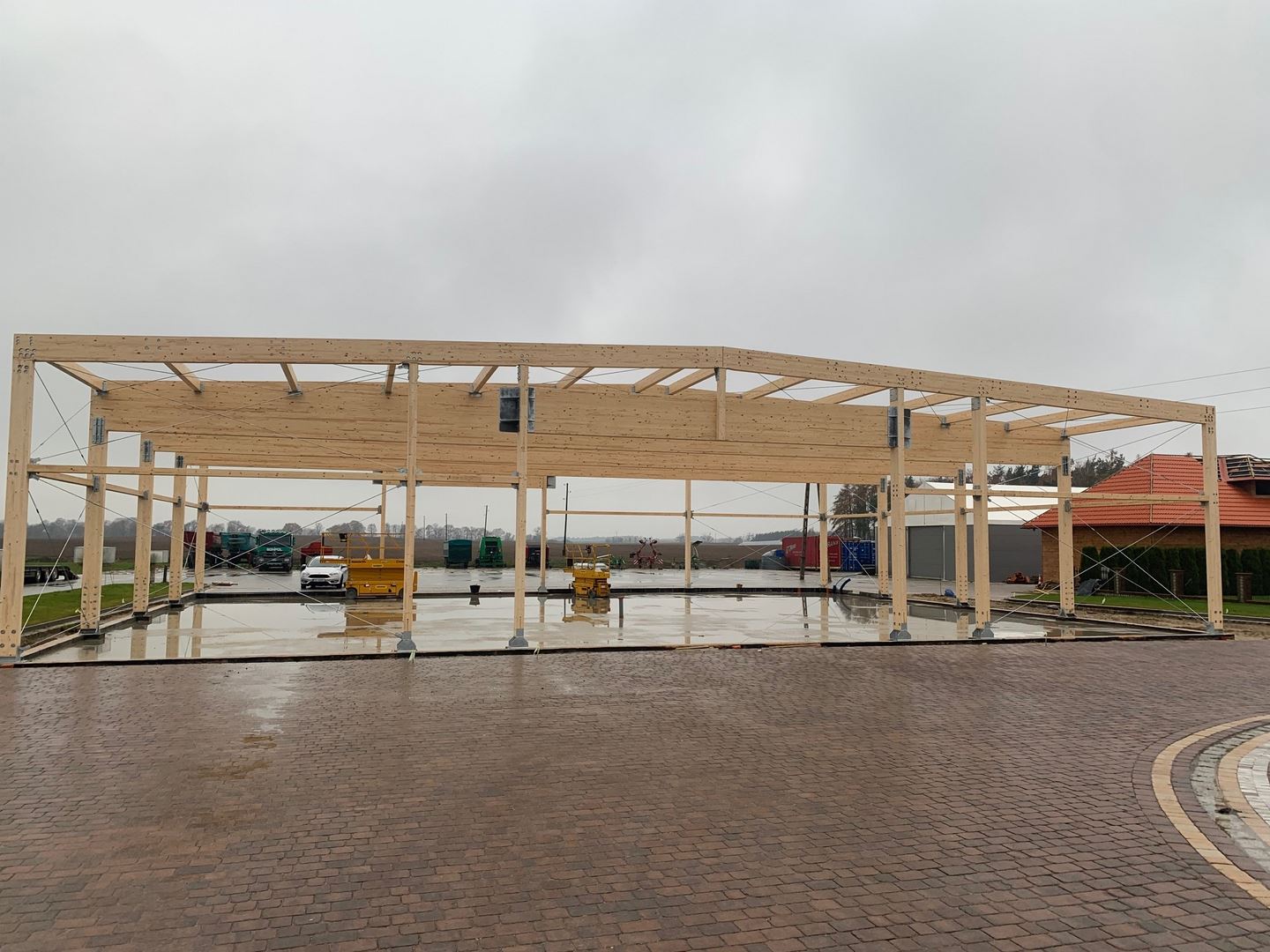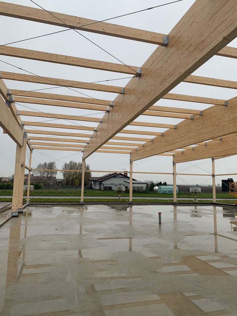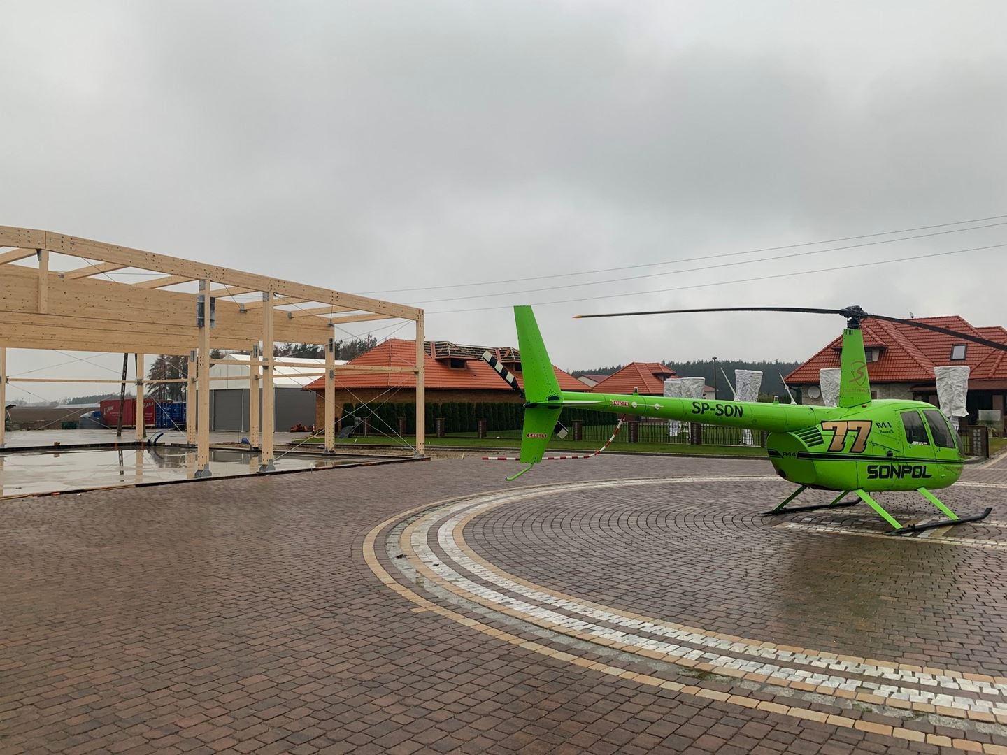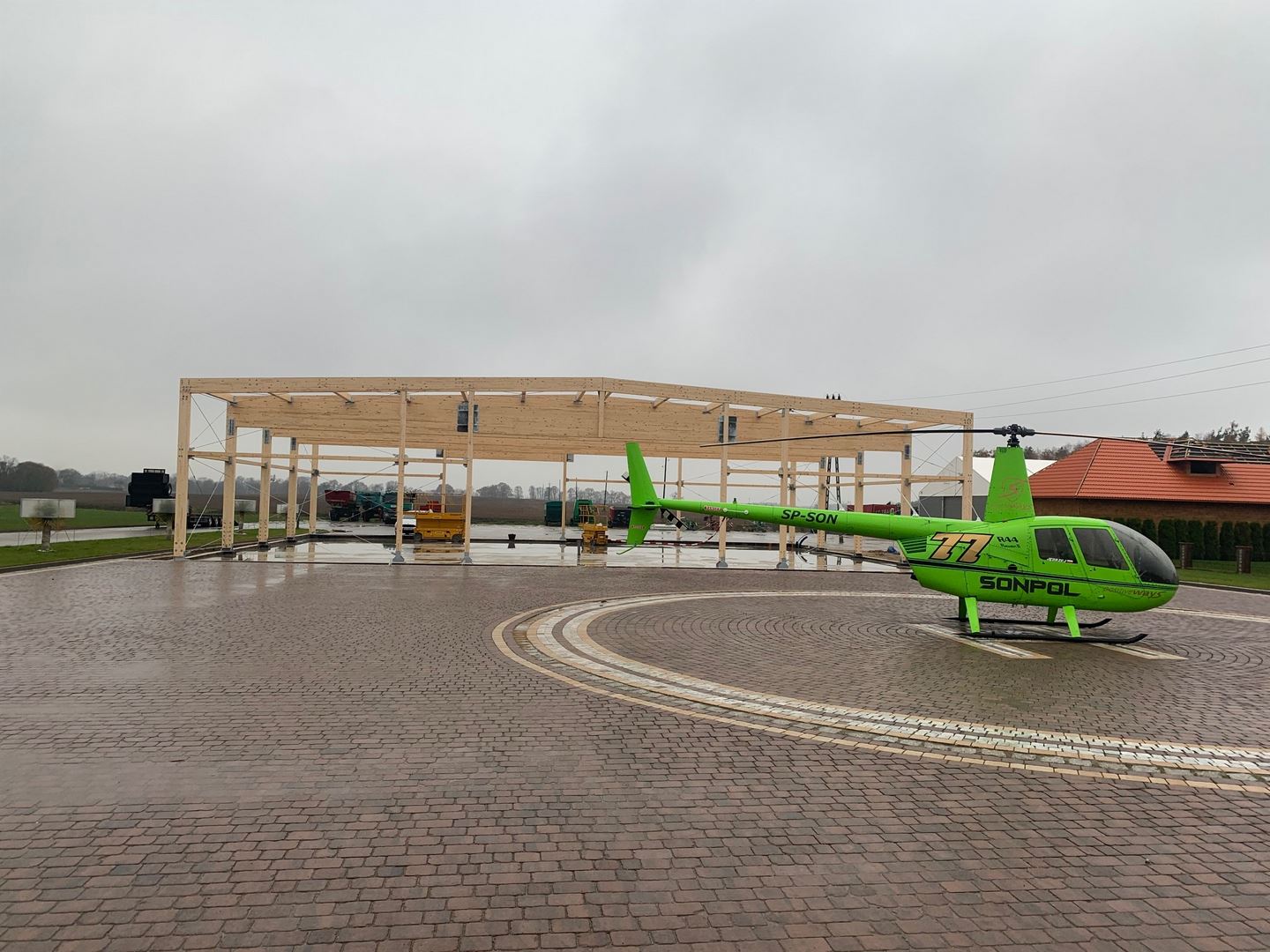 Kolejna kompleksowa realizacja obejmująca projekt, dostawę oraz montaż konstrukcji z drewna klejonego. Konstrukcję nośną hali stanowią ramy z drewna klejonego składające się ze słupów oraz dźwigarów dwutrapezowych. Dopełnieniem konstrukcji są płatwie dachowe połączone przegubowo z dźwigarami i słupami. W celu usztywnienia konstrukcji zaprojektowano układ stężeń połaciowych oraz ściennych. Hala będzie pełniła rolę "garażu" dla helikoptera.