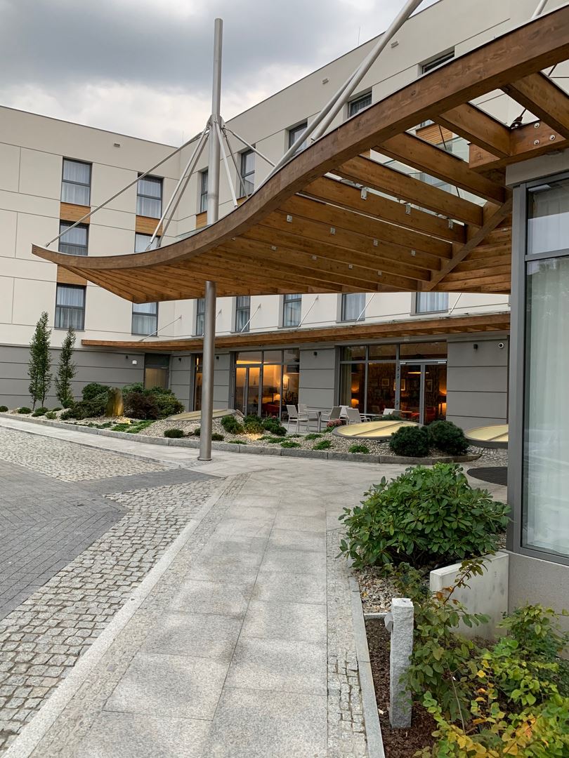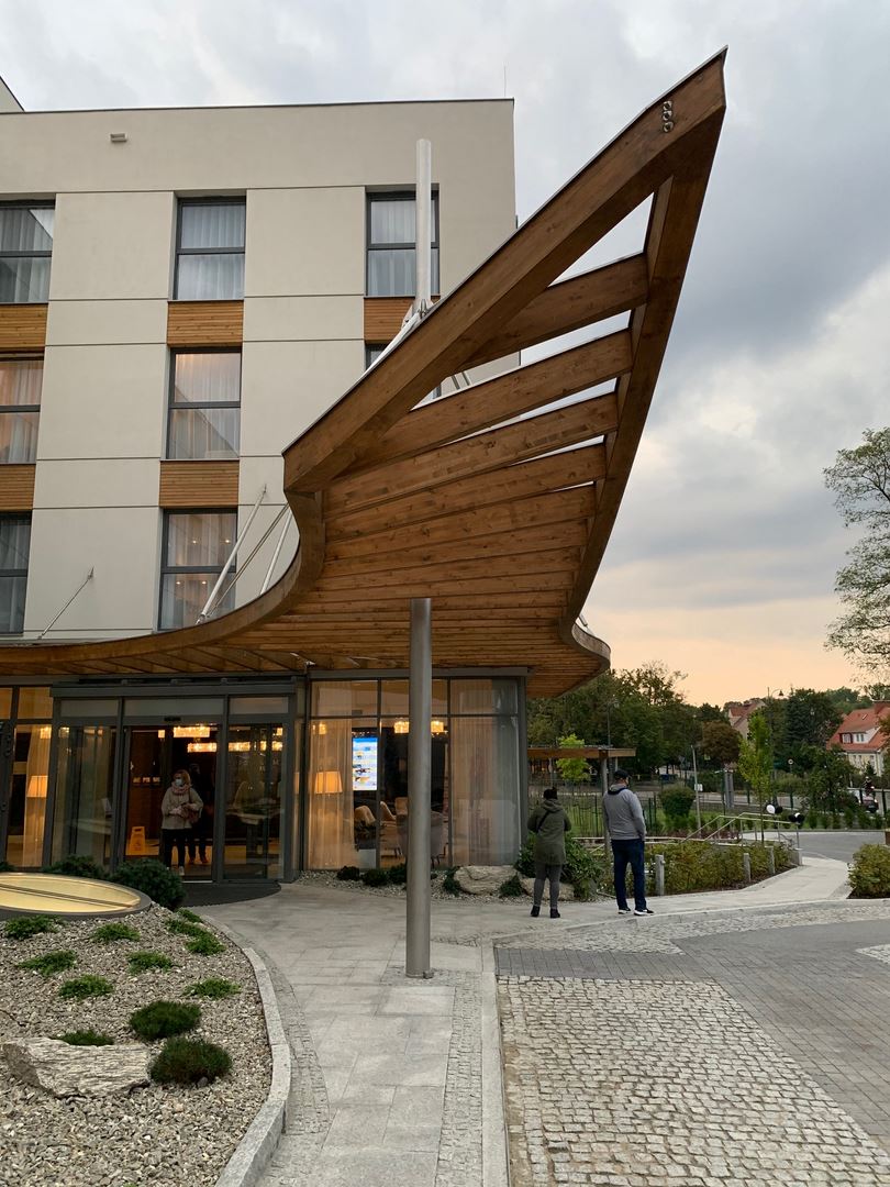 Niezwykle efektowne i nowoczesne zadaszenie nad wejściem do SopotoriumMedical Resort & SPA wykonane z drewna klejonego to kolejna realizacja firmy NordWOOD. Główną konstrukcję nośną stanowią dźwigary (belki obwodowe i koszowe) z drewna klejonego oparte na słupach stalowych i podwieszone do układu odciągów wykonanych ze stali nierdzewnej, które wraz z krokwiami tworzą wspornikowe podparcie dźwigarów.