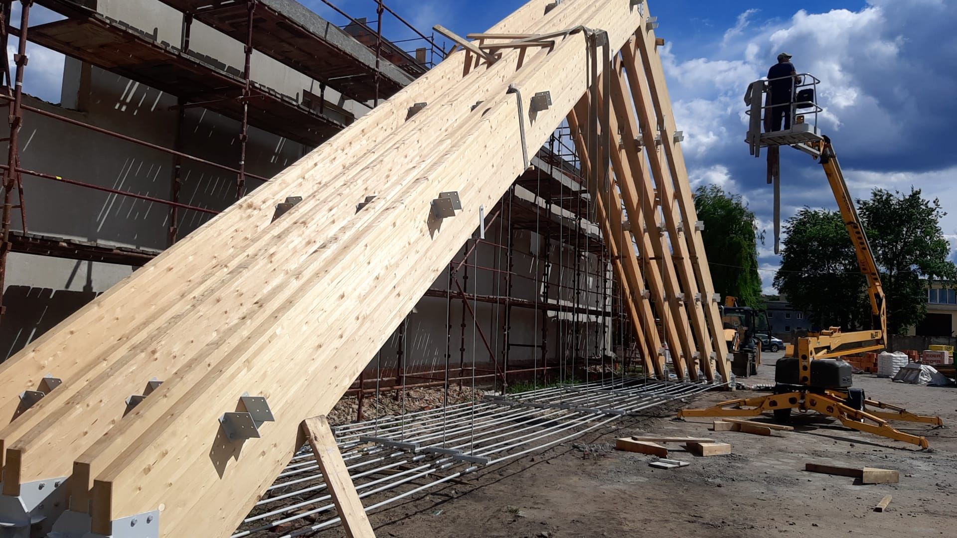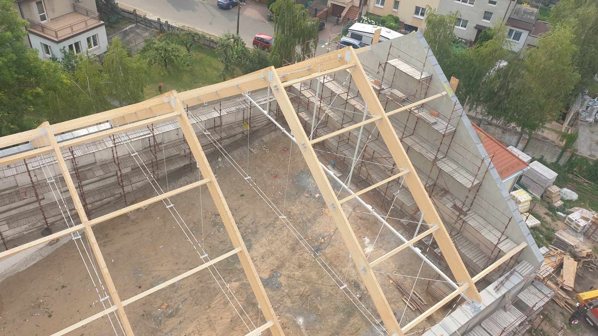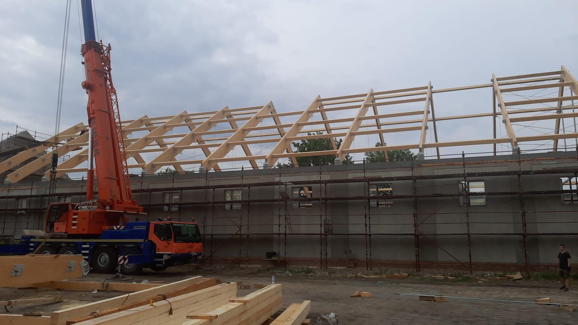 Nasza kolejna realizacja to konstrukcja dachu nad budynkiem szkoleniowym w Centrum Szkolenia Artylerii i Uzbrojenia w Toruniu. Główną konstrukcję nośną stanowią dźwigary z drewna klejonego połączone przegubowo ze ściągami. Razem tworzą dach dwuspadowy - układ trójprzegubowy. Dopełnienie konstrukcji stanowią płatwie, połączone przegubowo z dźwigarami.