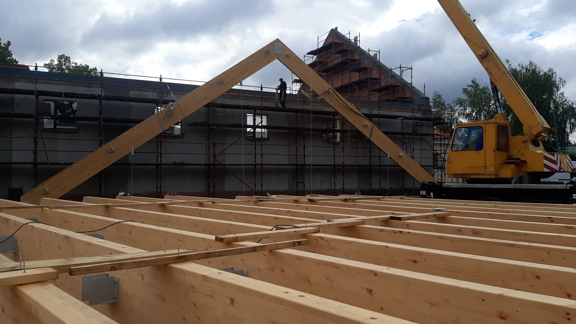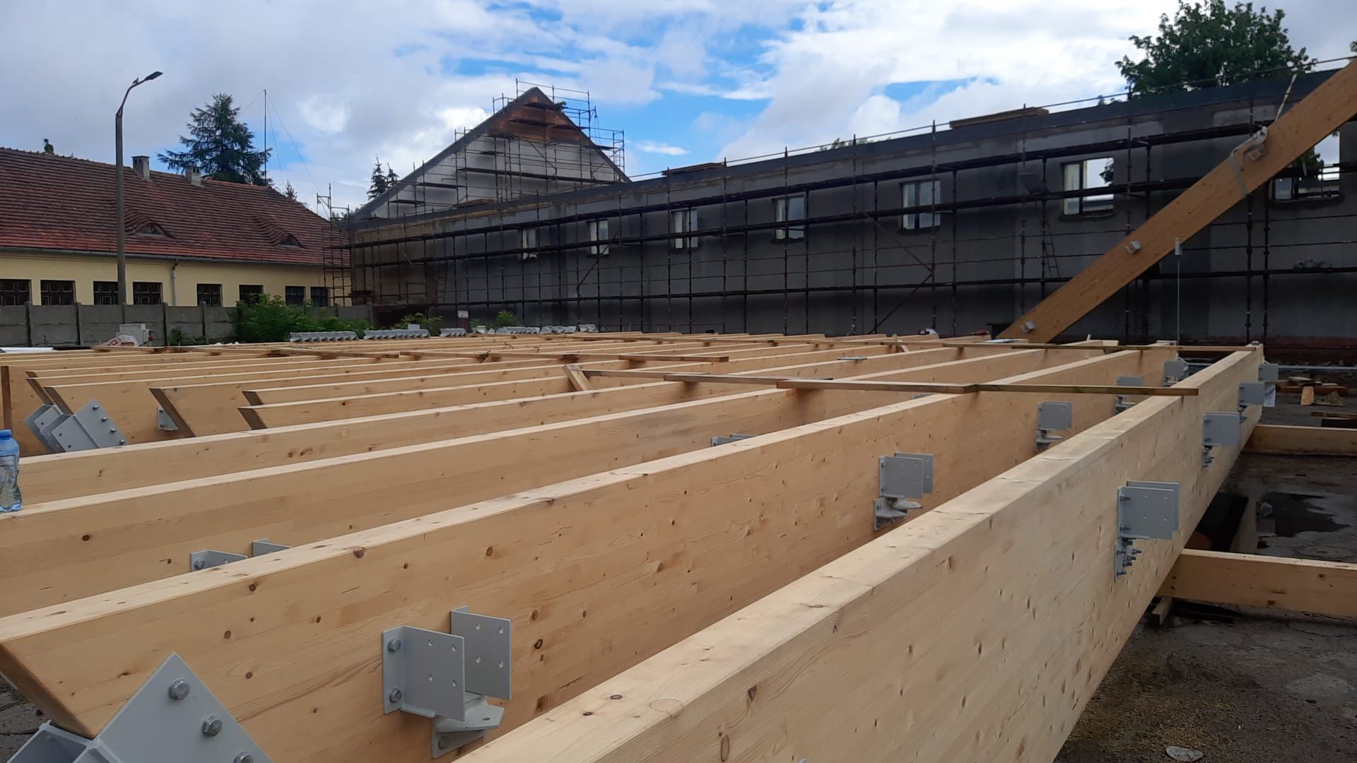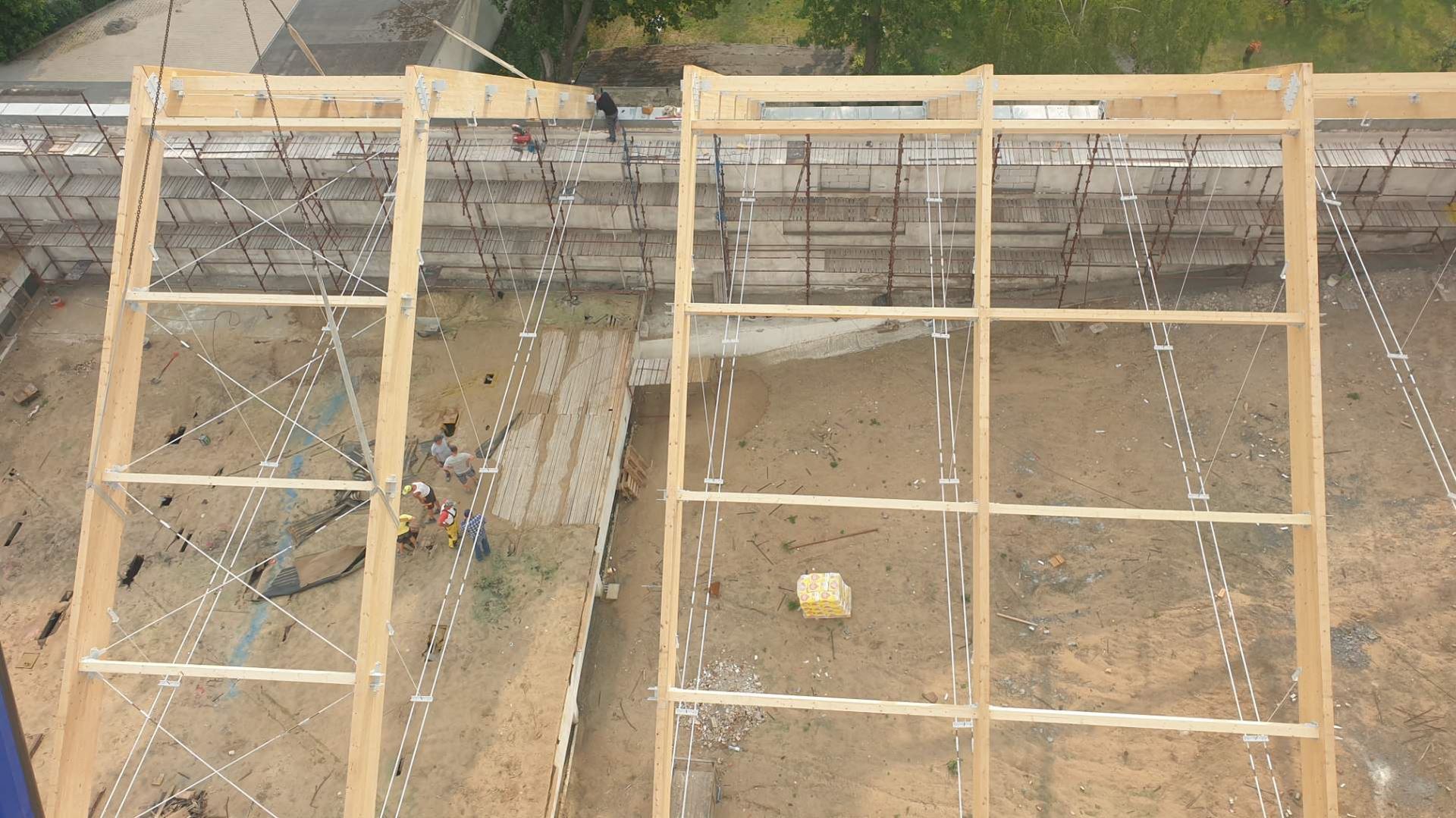 Nasza kolejna realizacja to konstrukcja dachu nad budynkiem szkoleniowym w Centrum Szkolenia Artylerii i Uzbrojenia w Toruniu. Główną konstrukcję nośną stanowią dźwigary z drewna klejonego połączone przegubowo ze ściągami. Razem tworzą dach dwuspadowy - układ trójprzegubowy. Dopełnienie konstrukcji stanowią płatwie, połączone przegubowo z dźwigarami.