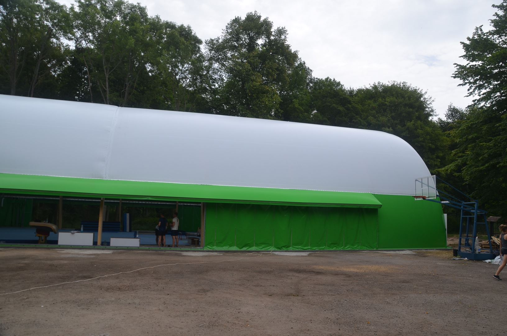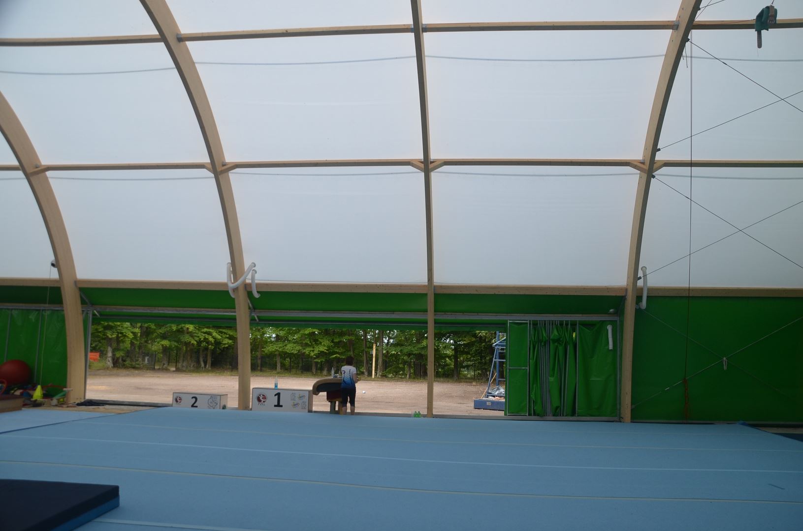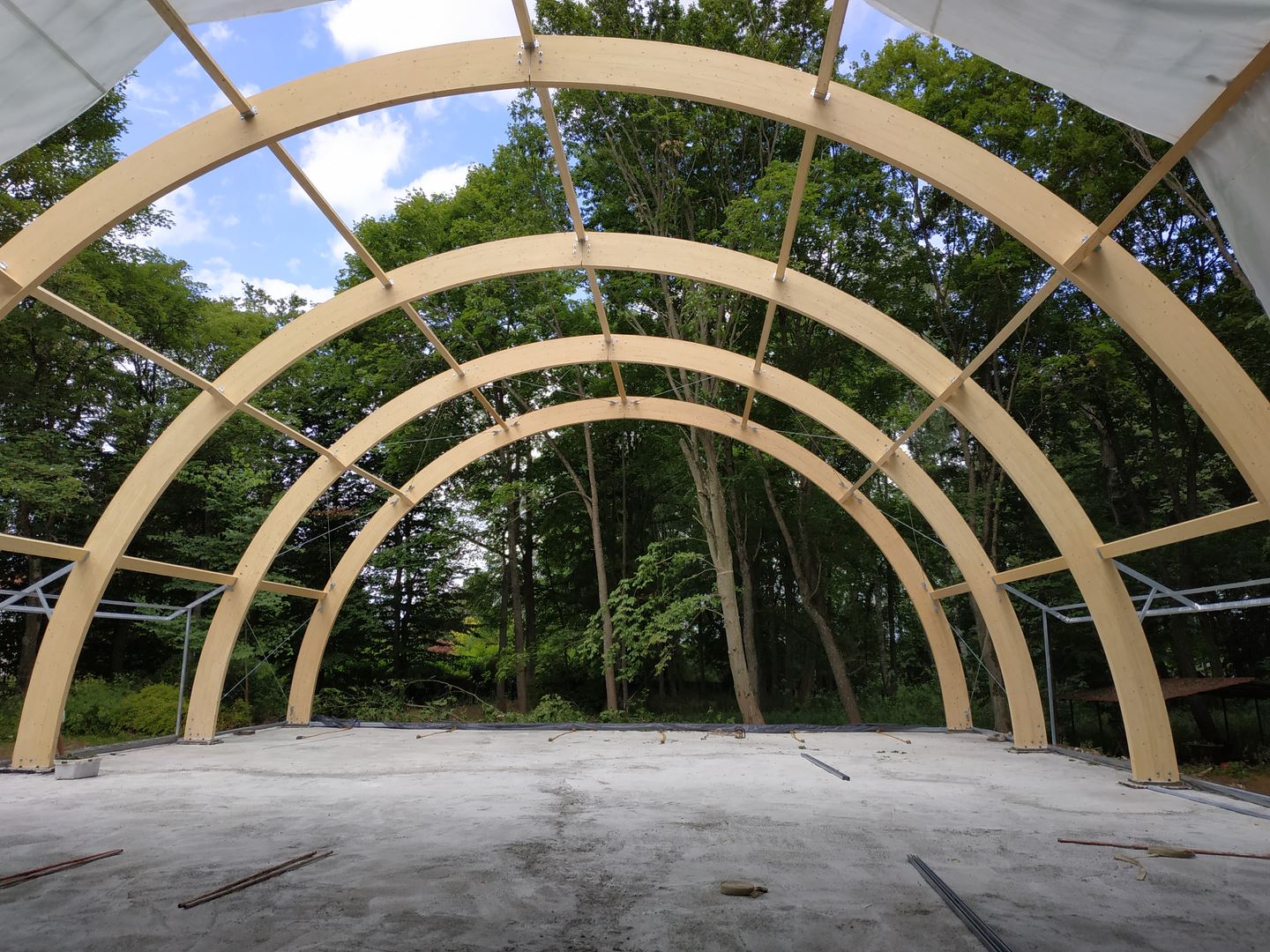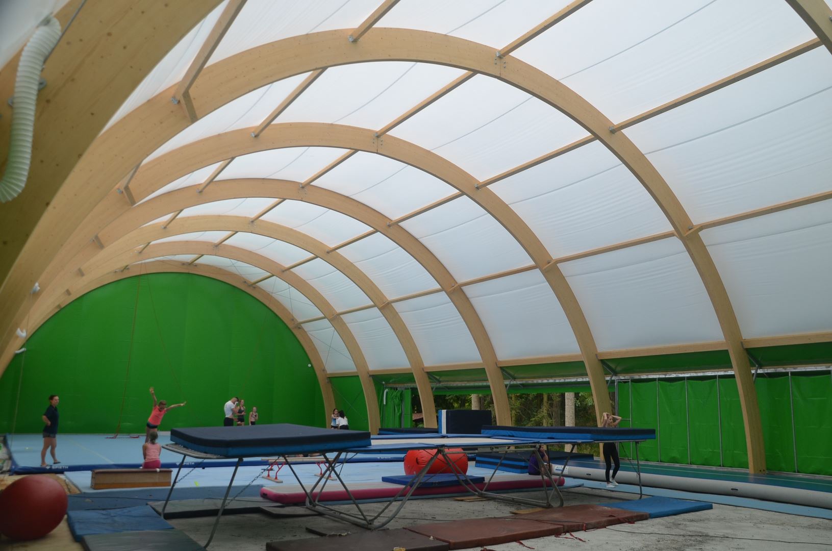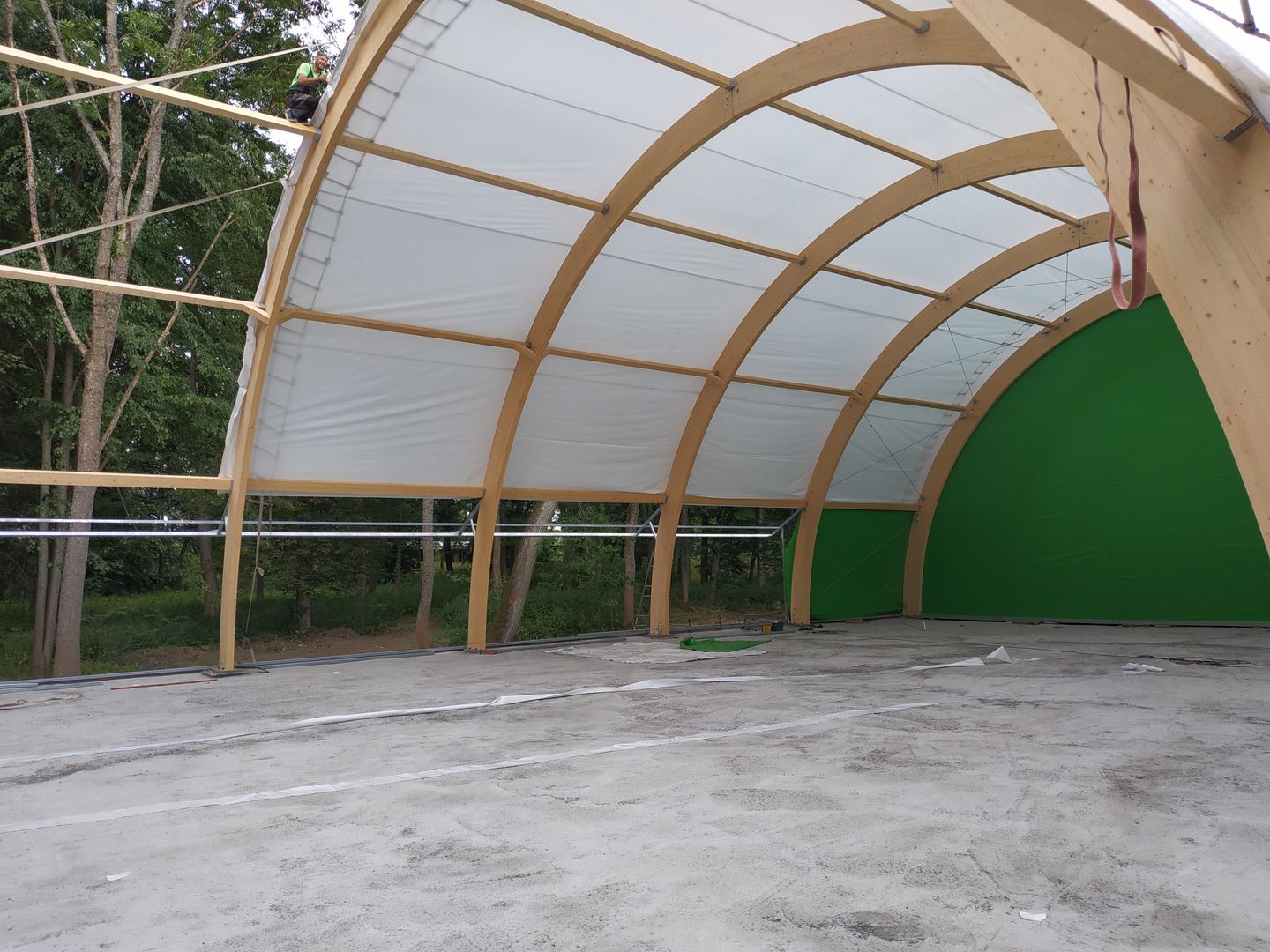 Główną konstrukcję nośną stanowią dźwigary łukowe z drewna klejonego tworzące dach w kształcie półbeczki. Dopełnieniem konstrukcji są płatwie i tężniki dachowe. Całość konstrukcji jest pokryta trudno zapalną powłoką membranową PVC