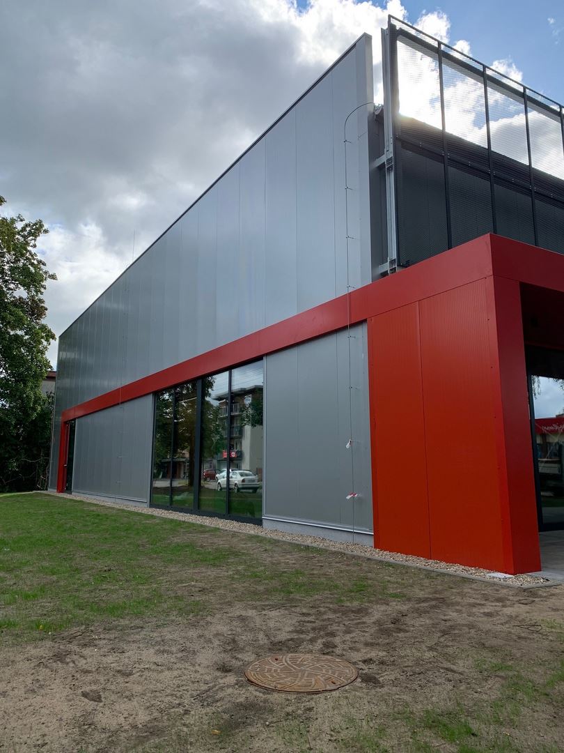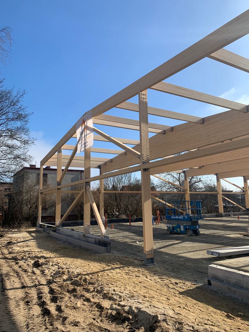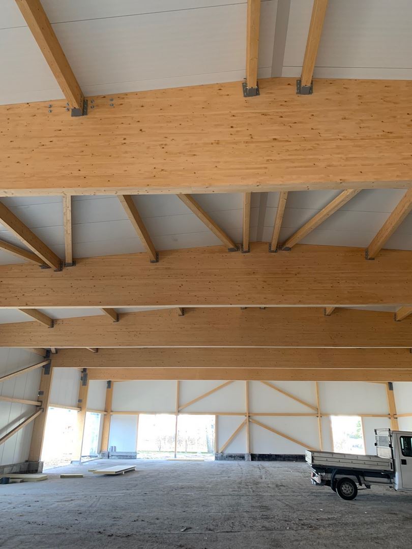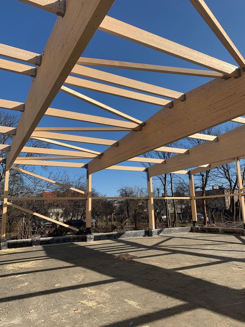 Kompleksowy zakres naszych usług obejmował projekt, dostawę oraz montaż konstrukcji budynku handlowo - usługowego z drewna klejonego wraz z obudową ścian i poszyciem dachu. Dźwigary oparte na słupach z drewna klejonego tworzące ramę dwuprzegubową. W części pionowej budynku zastosowano dźwigary dwutrapezowe, a w ścianach szczytowych dźwigary proste.