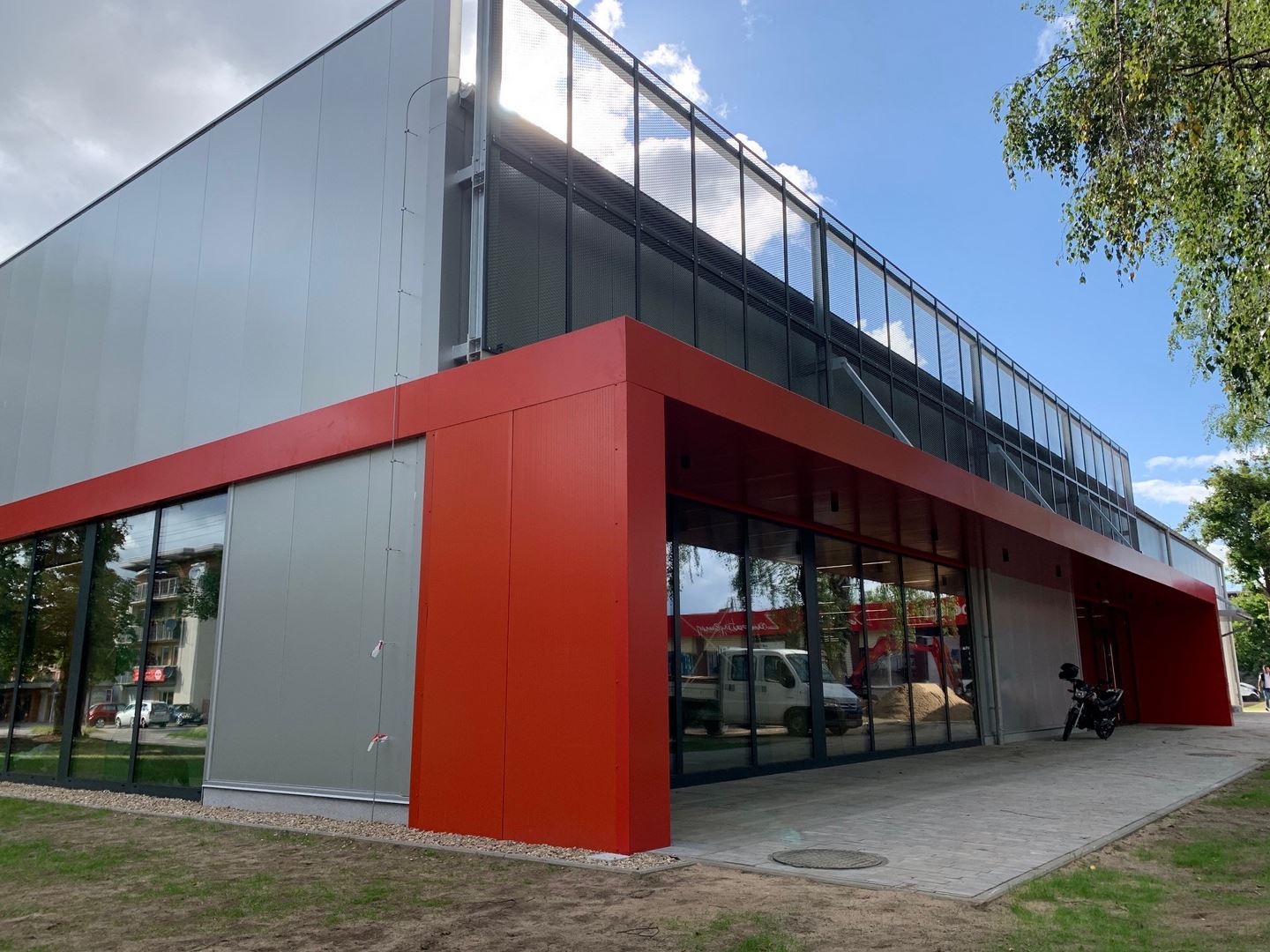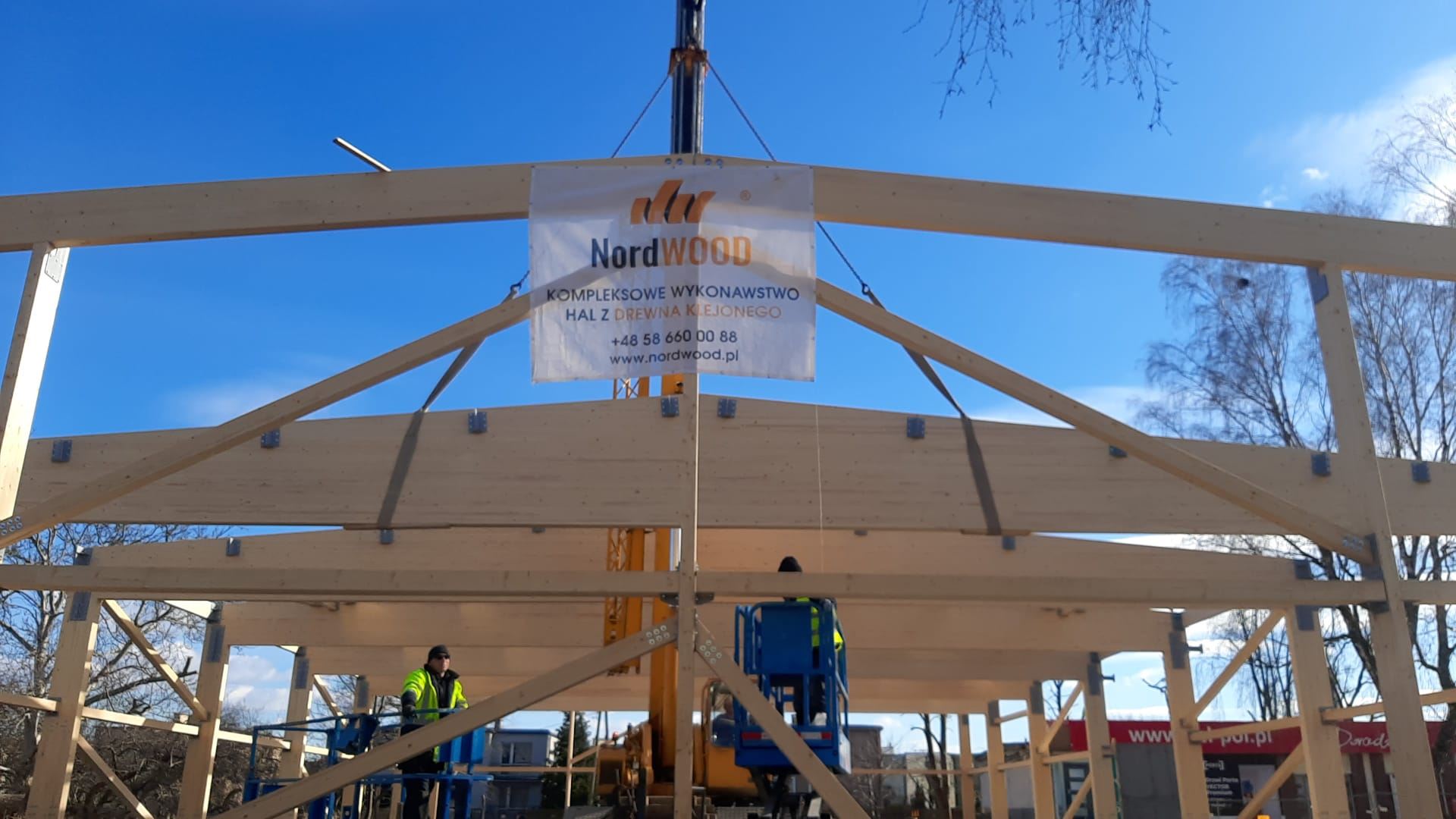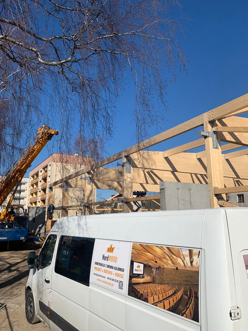 Kompleksowy zakres naszych usług obejmował projekt, dostawę oraz montaż konstrukcji budynku handlowo - usługowego z drewna klejonego wraz z obudową ścian i poszyciem dachu. Dźwigary oparte na słupach z drewna klejonego tworzące ramę dwuprzegubową. W części pionowej budynku zastosowano dźwigary dwutrapezowe, a w ścianach szczytowych dźwigary proste.