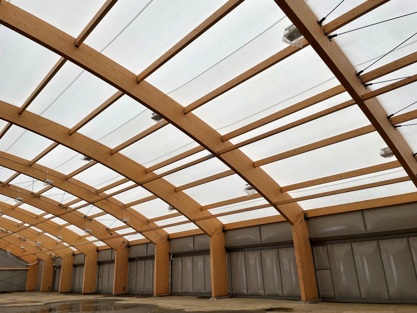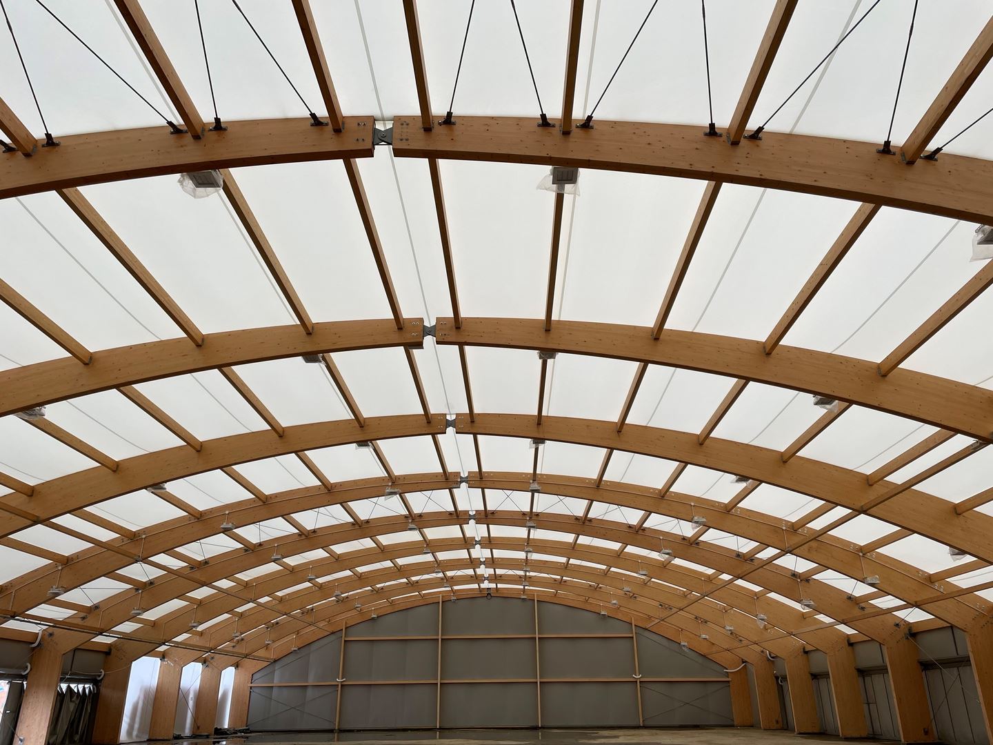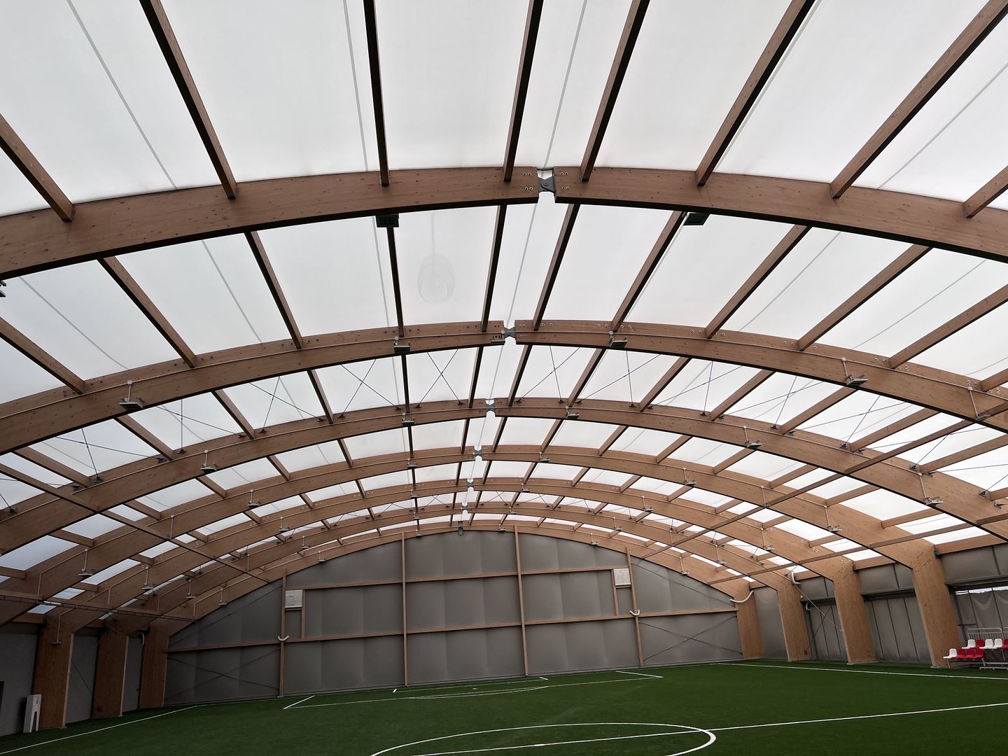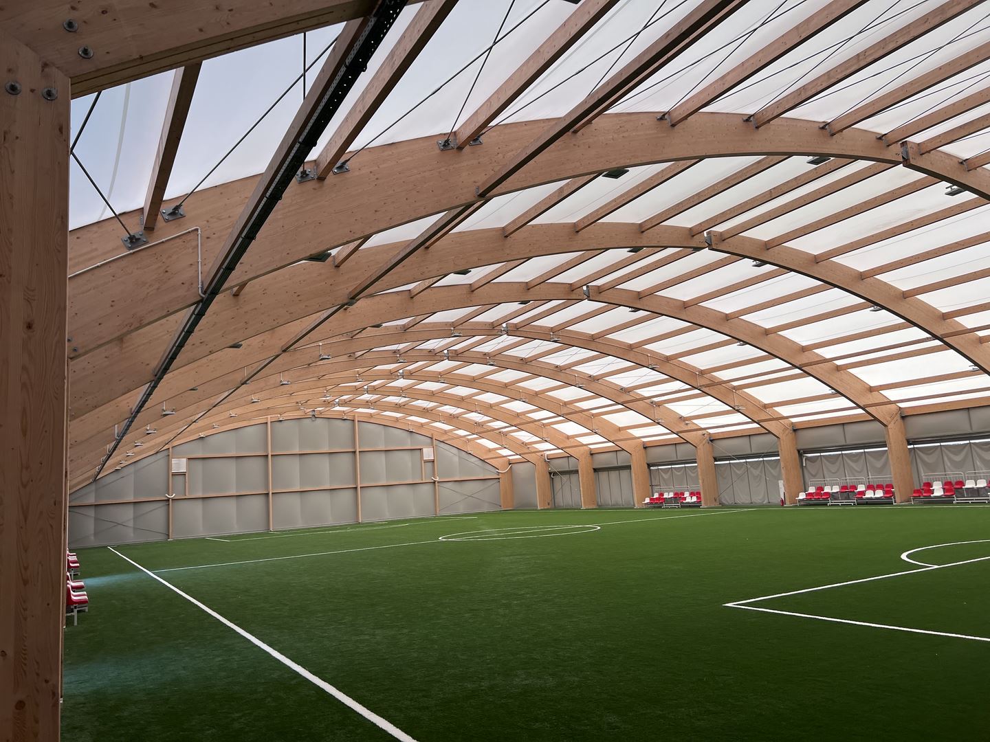 Główną konstrukcję nośną stanowią ramy składające się ze słupów połączonych przegubowo z konstrukcją żelbetową fundamentów oraz na sztywno z dźwigarem łukowym. Poszczególne elementy połączone są wzajemnie za pośrednictwem stalowych łączników indywidualnych. Elementy drugorzędne konstrukcji stanowią płatwie dachowe połączone przegubowo z dźwigarami. Usztywnieniem konstrukcji dachowej są stężenia stalowe oraz płatwie dachowe rozmieszczone w każdym polu.