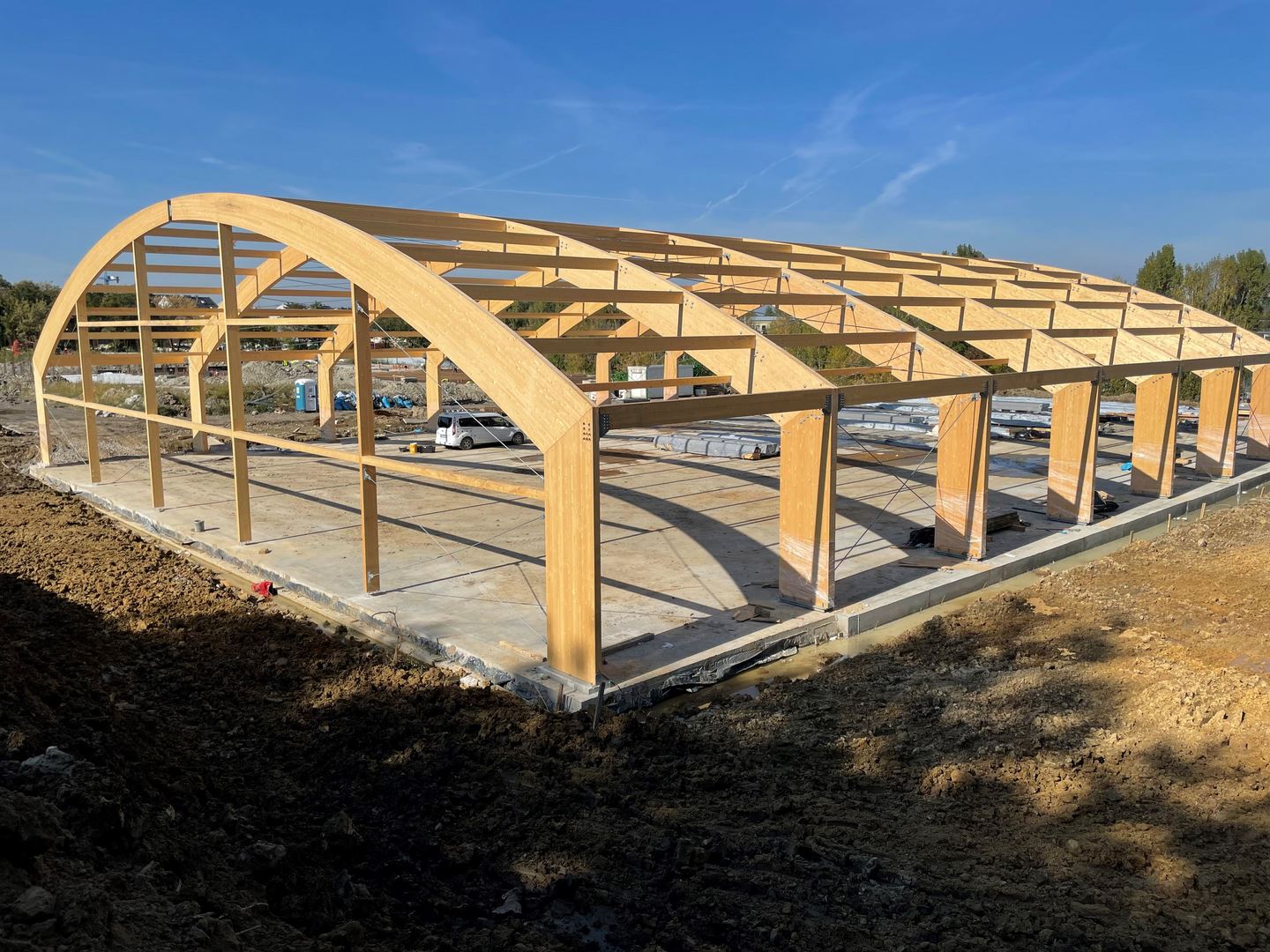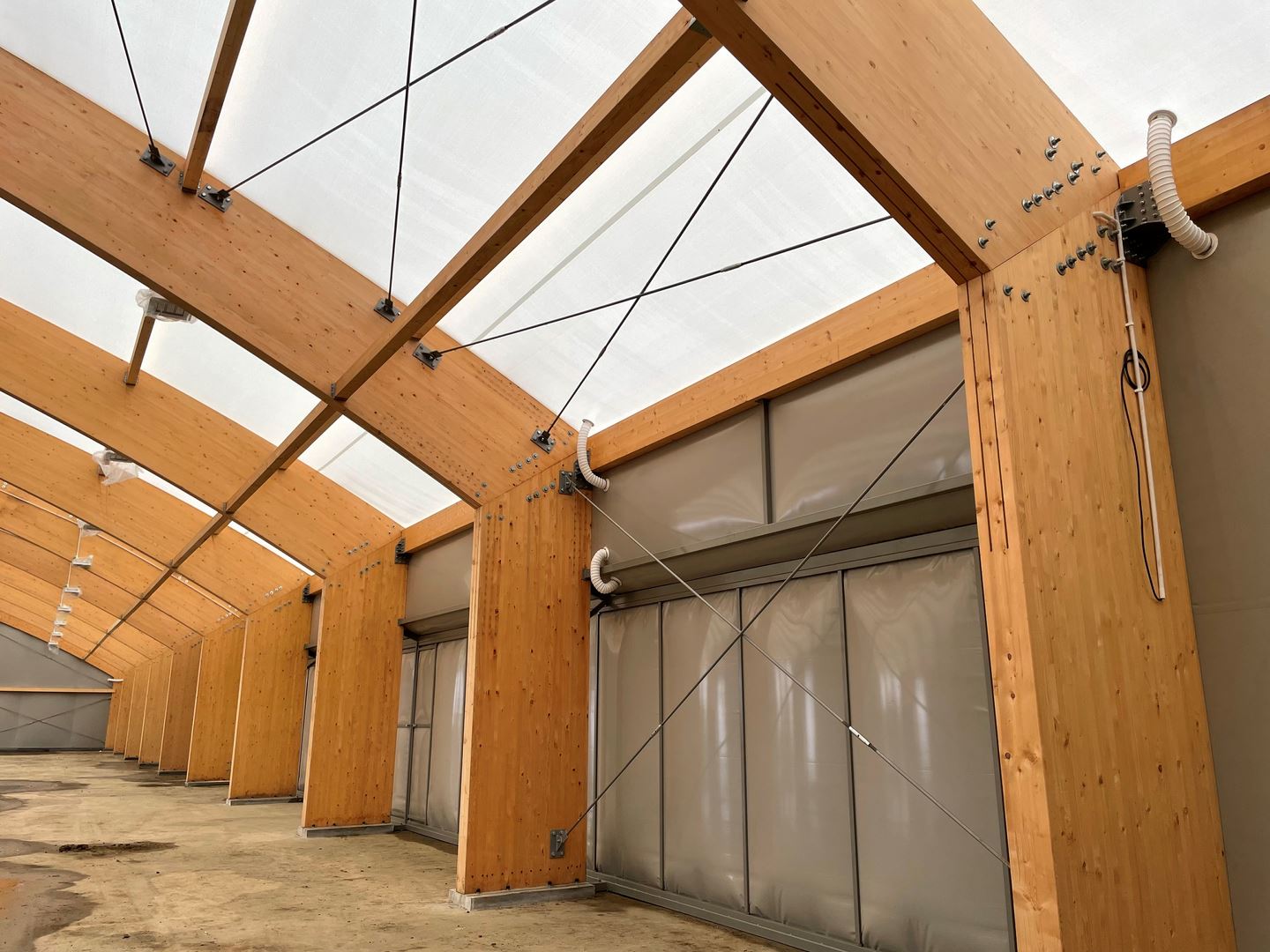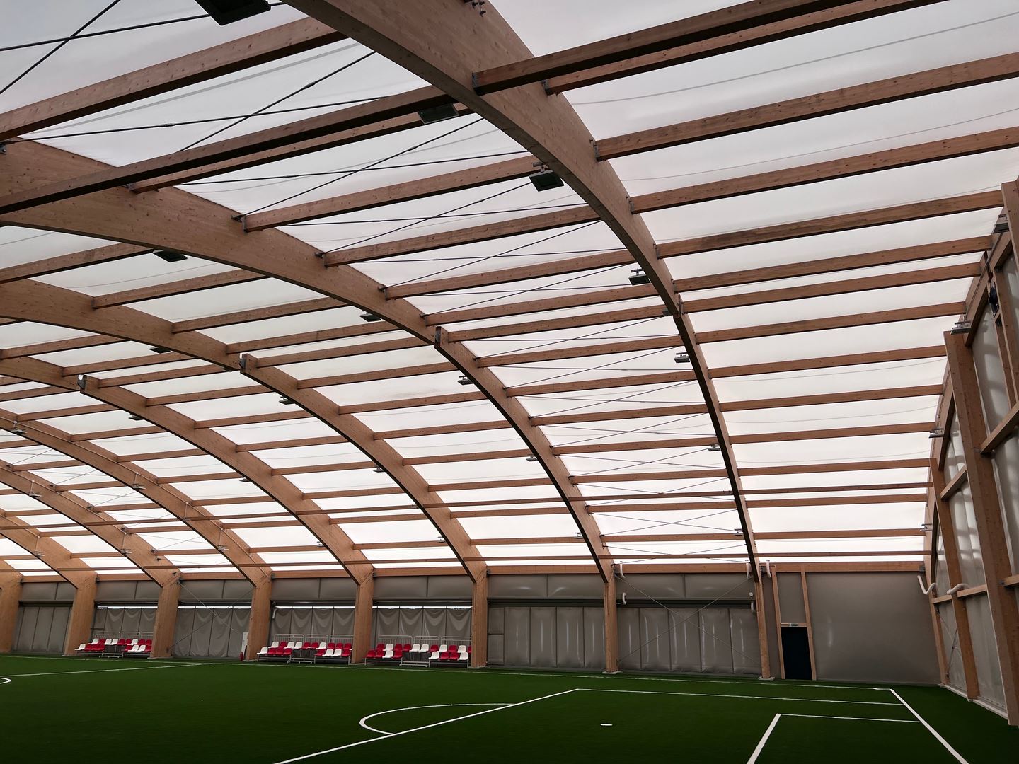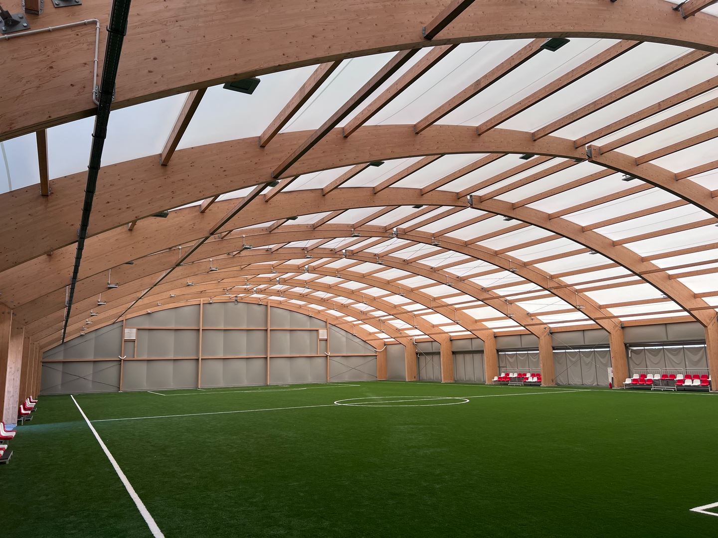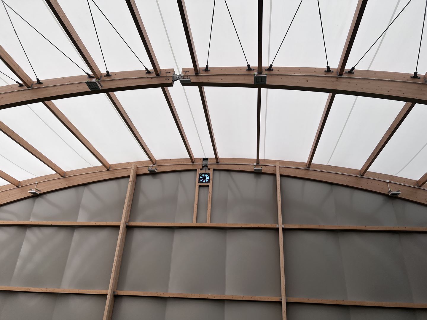 Główną konstrukcję nośną stanowią ramy składające się ze słupów połączonych przegubowo z konstrukcją żelbetową fundamentów oraz na sztywno z dźwigarem łukowym. Poszczególne elementy połączone są wzajemnie za pośrednictwem stalowych łączników indywidualnych. Elementy drugorzędne konstrukcji stanowią płatwie dachowe połączone przegubowo z dźwigarami. Usztywnieniem konstrukcji dachowej są stężenia stalowe oraz płatwie dachowe rozmieszczone w każdym polu.